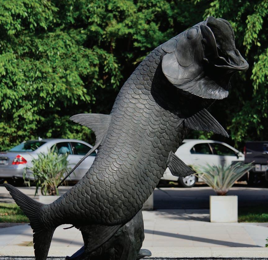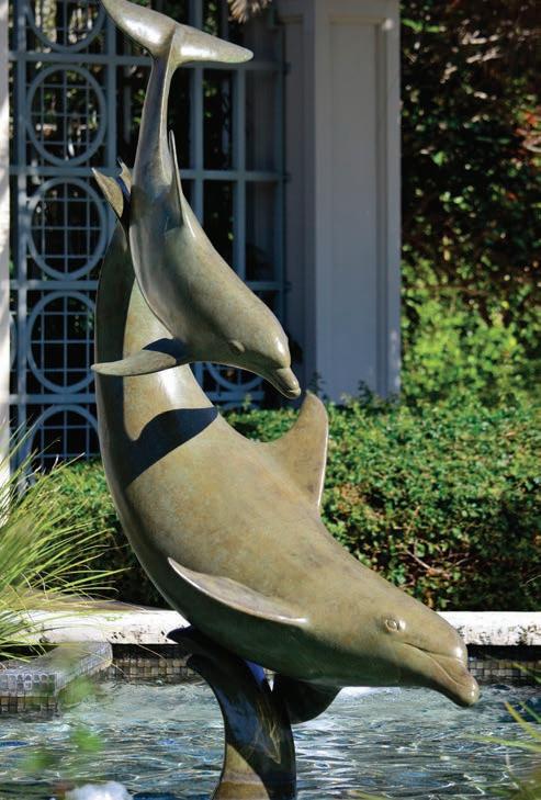 American artist D.H.S. “Duff” Wehle (b. 1950) is also a zoologist and environmentalist. His sculptures of various wildlife set out to capture the essence of animals in their natural state. Installed in the center of a water fountain, this sculpture creates the illusion that an Atlantic tarpon (also known as a Silver King) is jumping out of the ocean. The giants of the fish world, Atlantic tarpons can grow up up to 8 feet in length and can weigh up to 350 pounds. Despite their large size, they are one of the most aerial and acrobatic large game fish. Close inspection reveals the sculpture has two patinas: rich dark brown for the fish and green for the waves of water.
