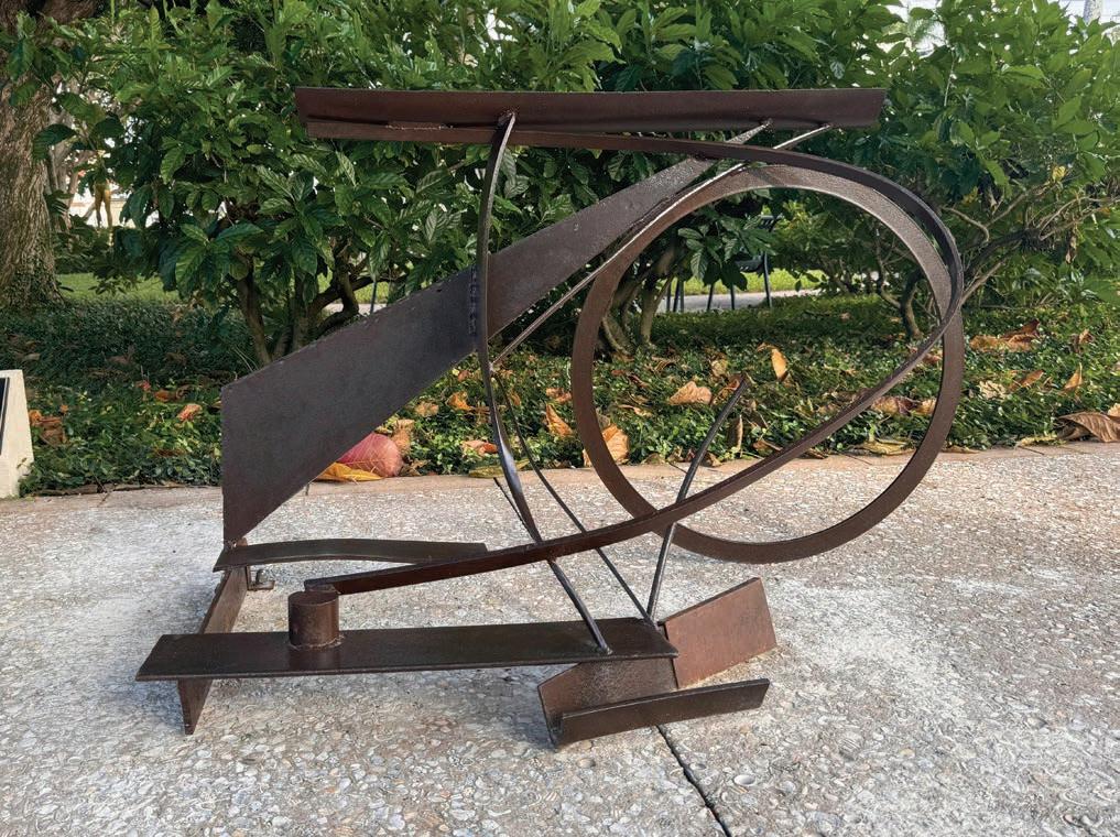 Located along the Intracoastal waterway is the monumental stainless-steel sculpture Intetra. This is the work of one of the 20th century’s most important and critically acclaimed American sculptors, Isamu Noguchi (1904–1988). The title Intetra comes from the word tetrahedron, which is a triangular pyramid composed of four planes—three sides and a bottom. If you peek inside the sculpture, you will notice a series of pipes that control a mist fountain. Due to mineral deposits caused by the South Florida climate, this feature had to be disconnected shortly after it was installed in the late 1970s. Conservation in 2020 restored the pattern of brushwork on the steel surfaces, which adds a pictorial dimension to the work.