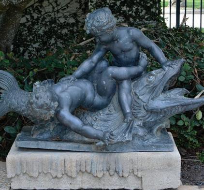 These whimsical sculptures depict pairs of putti riding fantastical sea creatures. Putti are representations of chubby, nude male children, often with wings, that frequently appear in mythological and religious paintings and sculptures. Cast in lead, a heavy metal that is dense but also soft and malleable, they are based on sculptures decorating the Jardins d’Annevoie surrounding the Château d’Annevoie in Namur, Belgium. The sculpture on the right is a direct copy of a sculpture that served as a fountain in the extensive water gardens, the source of which is the River Rouillon.