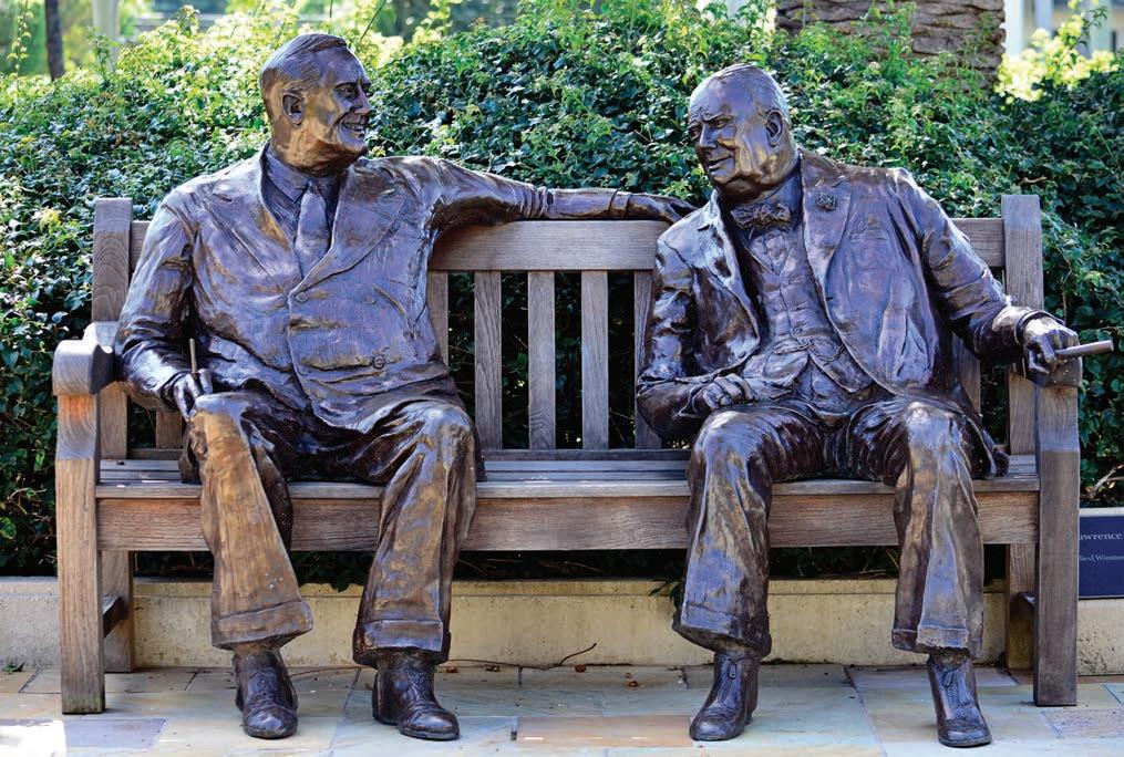 Allies, made by American-British sculptor, poet, lyricist, playwright, novelist, actor, and director Lawrence Holofcener (1926–2017), is the most popular sculpture in the Sculpture Garden. The life-sized portraits depict former American President Franklin D. Roosevelt and former British Prime Minister Sir Winston Churchill in a relaxed conversation while seated on a bench. The original sculpture, which Princess Margaret unveiled in 1995 to commemorate 50 years of peace since World War II, is permanently displayed on Bond Street in London. This is one of only six other casts the artist made. Allies is an approachable sculpture, with the space in between the two leaders open for visitors to occupy. We invite you to sit here and pose for pictures.