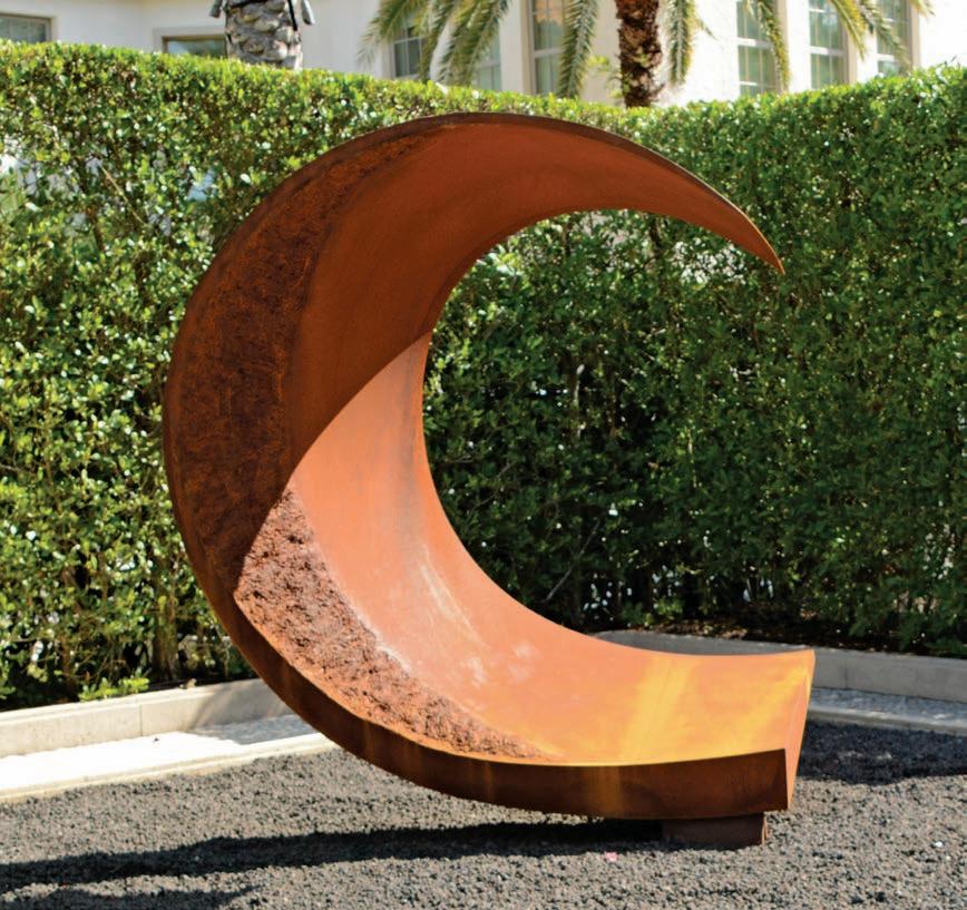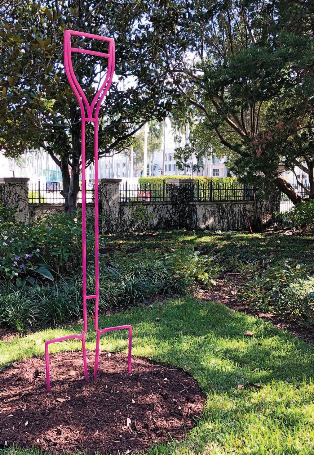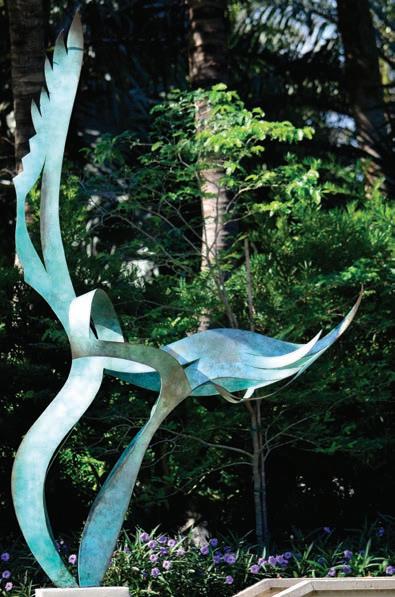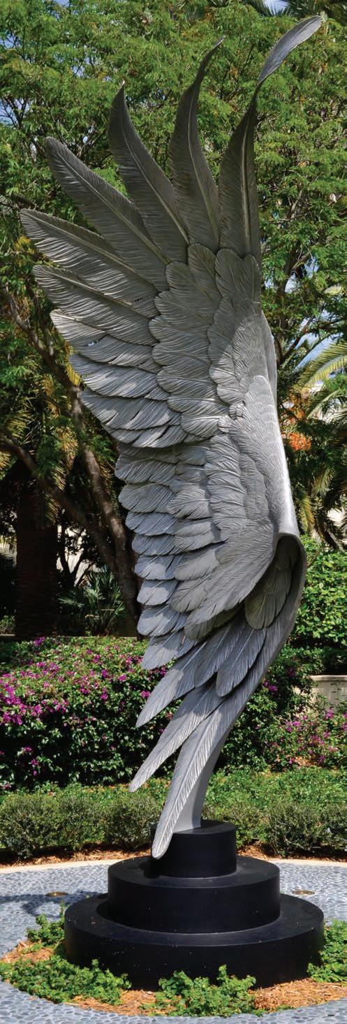John Raimondi (b. 1948), a long-time resident of Palm Beach County, created this 10-foot tall sculpture after a 60-foot version he made for the Omaha International Airport in Nebraska. Collectively they are from a series depicting endangered species. Crafted in his signature style of romantic abstraction, this statue captures cranes in flight during their ritual mating dance. The green patina, or surface coating of the sculpture, also activates the piece.