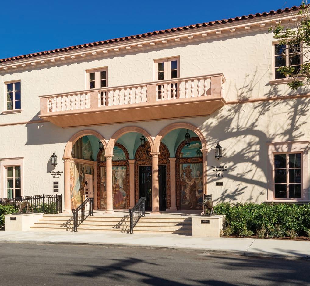 In 1937, The Four Arts hired Swiss-born American architect Maurice Fatio (1897–1943) to design the first building to house The Society of the Four Arts. Upon its opening on January 8, 1938, it was used for lectures, concerts, art exhibitions, children’s programs, a library, and staff offices, but today serves as The Four Arts’ library. In 1996 it was named in honor of Giaconda and Joseph King, who were generous donors. The most famous part of the building is the west loggia, where murals depicting personifications of art, literature, drama, and music painted in 1939 by American artist Albert Herter (1871-1950) adorn the walls. Over time, the murals deteriorated, and local painter Zenon Toczek recreated them in 2018 at the same time the entire building underwent a major restoration.
