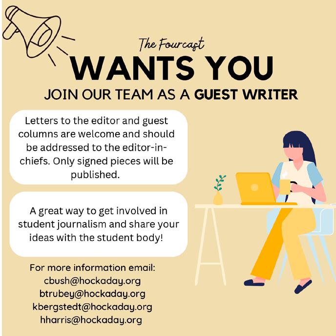 The Fourcast is written primarily for students of the Hockaday Upper School, its faculty and staff. The Fourcast has a press run of 1,200 and is printed by Midway Press. It is distributed free of charge to the Hockaday community. The staff reserves the right to refuse any advertising which is deemed inappropriate for the Hockaday community. Opinions will be clearly marked and/or will appear in the views section. Commentaries are the expressed opinion of the author and do not necessarily reflect that of The Fourcast staff, its adviser or any other member of the Hockaday community. The Staff Stance on the views page reflects the position of The Fourcast staff, but not necessarily the position of the Hockaday administration or community. The Fourcast staff determines the content of each issue and strives to work as independently as possible in producing the student newspaper, but the content is subject to prior review by the head of Upper School, the communications director and other members of the Hockaday leadership team. Letters to the editor and guest columns are welcome and should be addressed to the editor-in-chief. Only signed pieces will be published. Corrections and clarifications from previous issues will be found as designated in the news section. Any questions or concerns should be addressed to Editors-in-Chief Kailey Bergstedt at kbergstedt24@hockaday.org, Caroline Bush at cbush24@hockaday.org, Harper Harris at hharris24@hockaday.org or Bennett Trubey at btrubey24@hockaday.org.