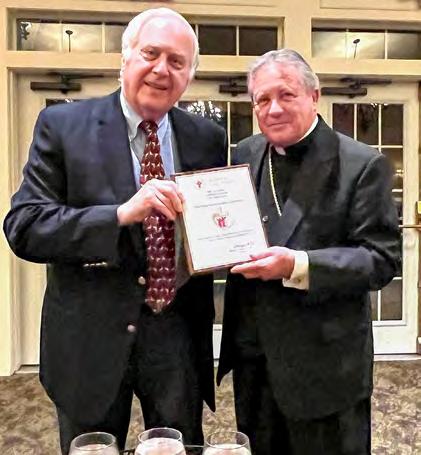 Before dinner, Bishop Cote greeted the Christophers, thanking them for their “unfailing support of the Annual Catholic Appeal.” Bishop Cote continued, “You truly do live your faith each and every day and because of your sacrifice and generosity, you keep our ministries doing the work of Christ.” Following dinner, Bishop Cote made a presentation to Mr. Ted and Mrs. Ruth Rossi of the Rossi Foundation and attorney Andrew Becker, of the Padre Pio Foundation of America, for providing the ACA’s first- ever donor matching grant initiative. Bishop Cote said, “The Rossi Foundation and the Padre Pio Foundation of America provided our ACA with a much-needed boost in the last quarter of the year, when they graciously agreed to match 50 cents on the dollar for all new donations that were received between September and December. Based on this initiative, donors came forward with moret than $200,000 in new donations, which the Rossi Foundation and the Padre Pio Foundation of America matched, donating $100,000, and bringing us to our goal.”