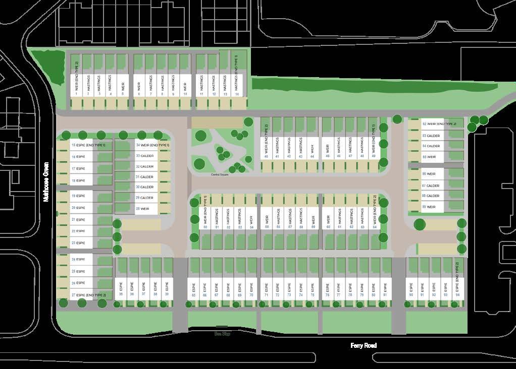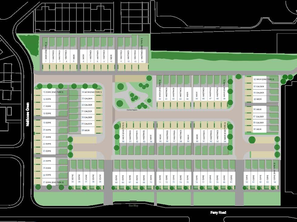Plots 18, 19, 23, 24, 35, 39, 65, 70, 71, 75, 76, 81 and 90 are end terraces homes; other plots noted above are mid terrace homes.