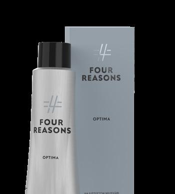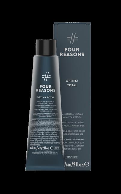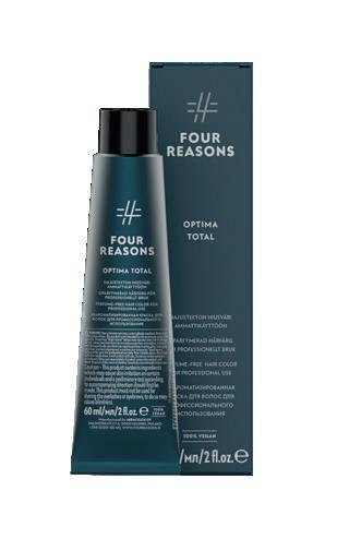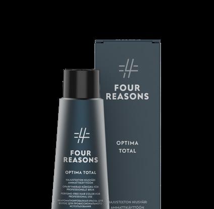 Four Reasons Optima Total on erityisesti tyvivärjäyksiin suunniteltu, 100 % harmaanpeiton takaava värituote. Four Reasons Optima Total -sarjalla värjääminen on poikkeuksellisen nopeaa: 10 minuutin vaikutusaika lyhentää värikäsittelyyn kuluvaa aikaa ja tarjoaa myös hyväkatteisen lisäpalvelumahdollisuuden. Four Reasons Optima Total