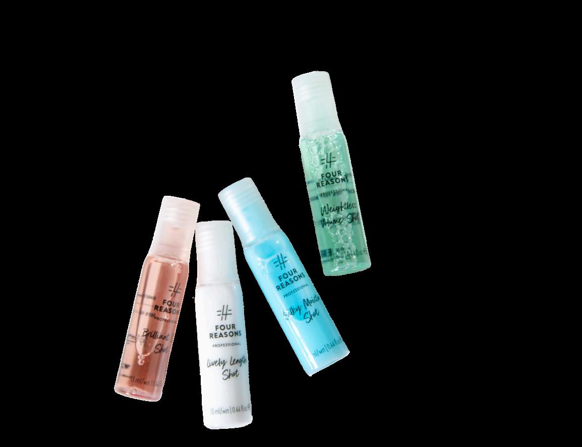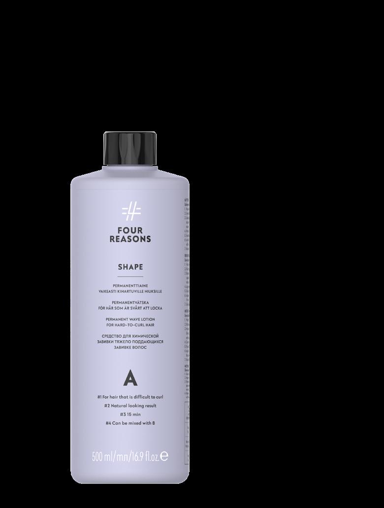 Four Reasons Shape -permanenttiaineissa on kolme eri vahvuista permanentti nestettä. Four Reasons Shape -permanenttinesteitä voidaan sekoittaa keskenään riippuen käsiteltävän hiuksen rakenteesta ja tehtävästä käsittelystä.