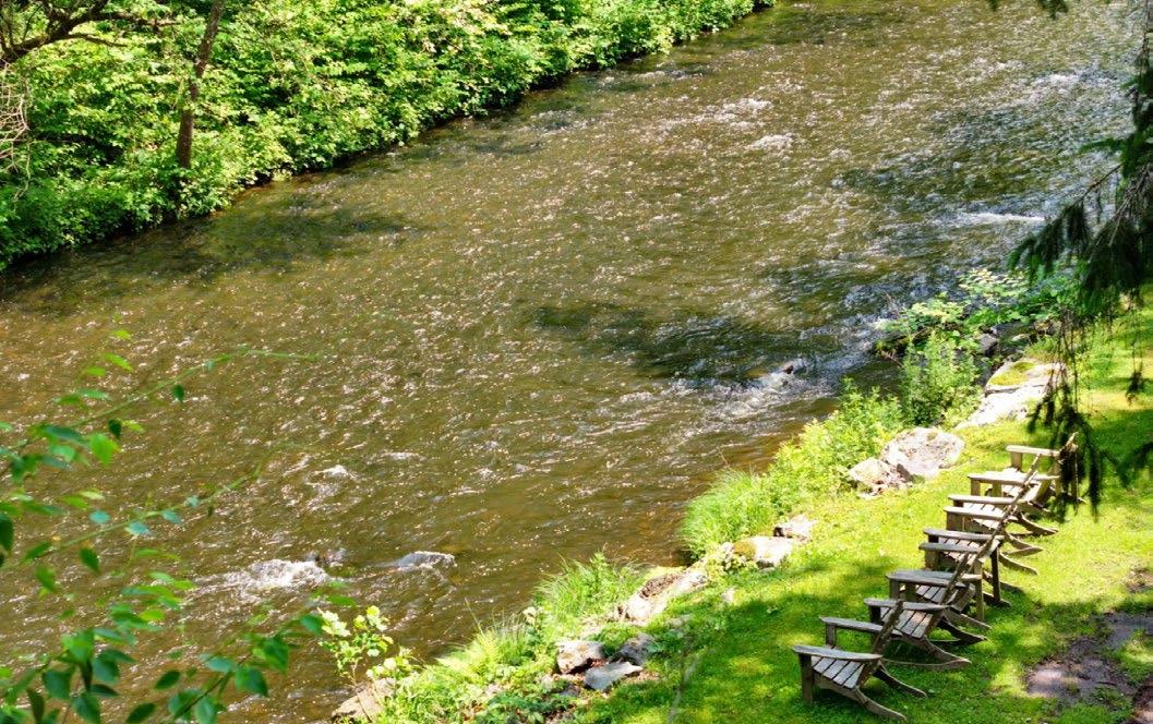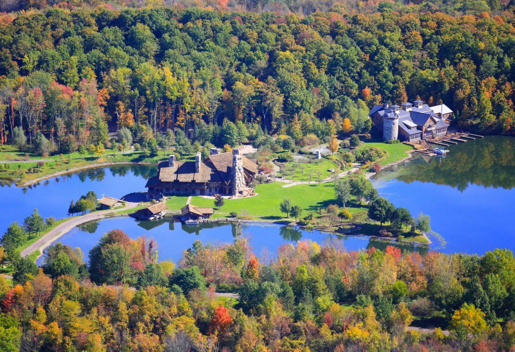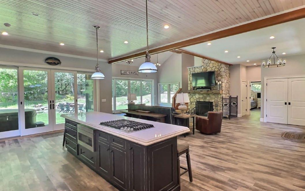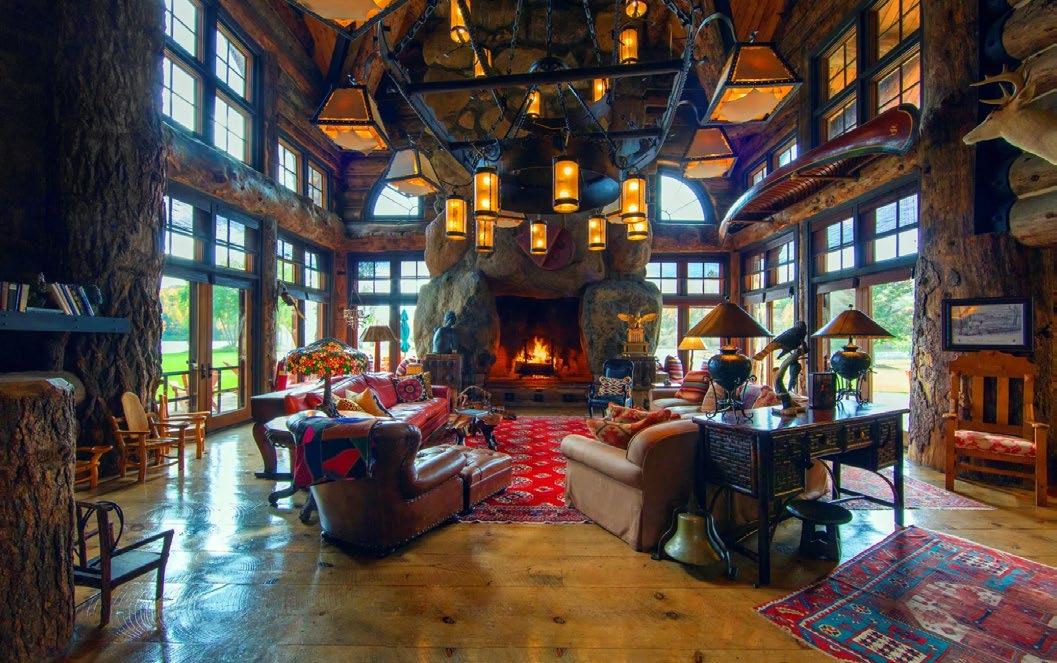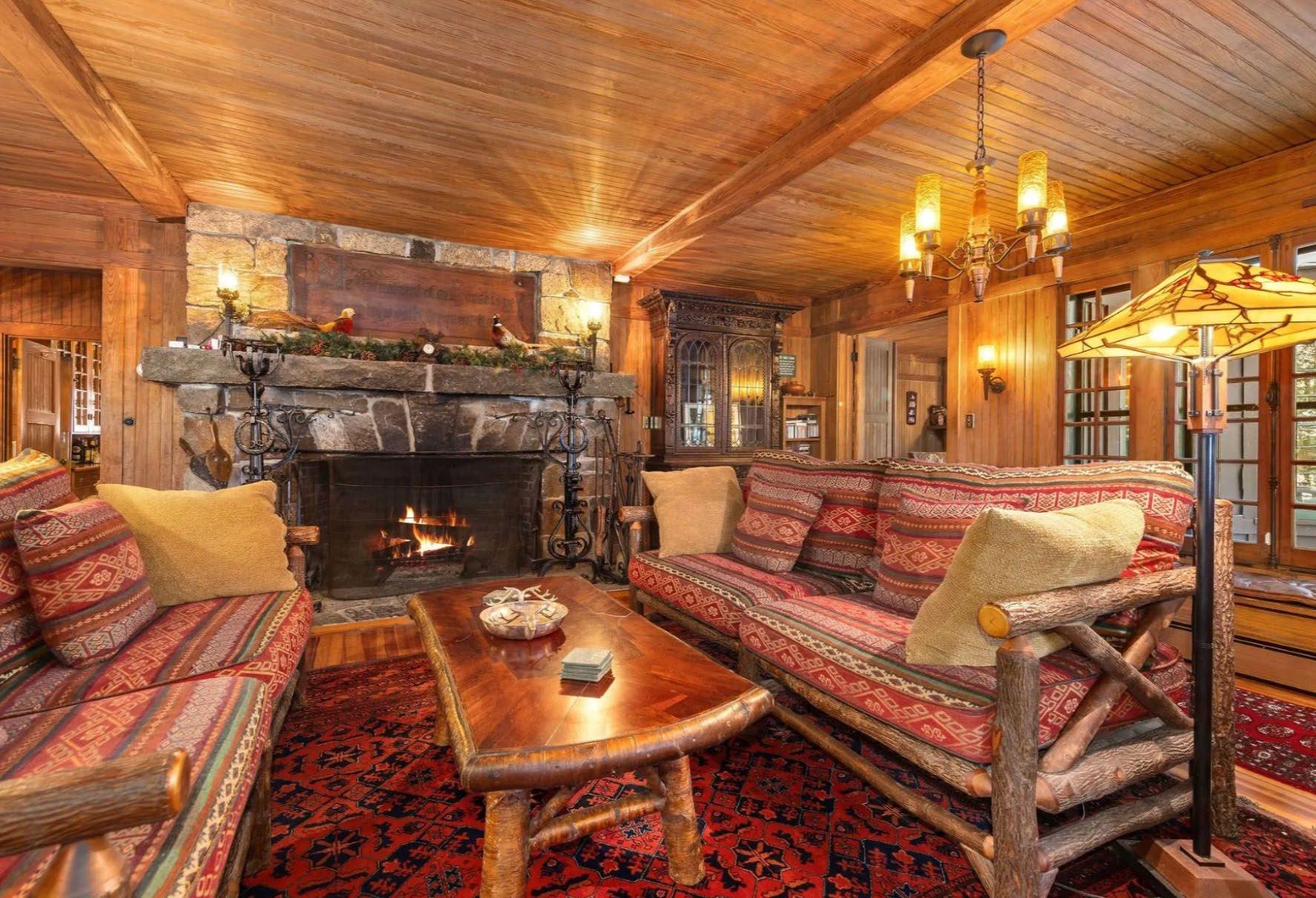 Serena Lodge was inspired by the legendary William Rockefeller estate in the Adirondacks, known as The Point, and thoughtfully designed to reflect its inviting look and warm, rustic elegance. This 9,000+ square foot residence sits atop a knoll beside a lively creek with small waterfalls, creating a peaceful, natural soundtrack. The Great Room is the centerpiece of the home, with a soaring stone fireplace, floor-to-ceiling windows, two sitting areas, and an open kitchen framed by thick granite counters. Just outside, a terrace with built-in barbecue and stairs leads down to the creekside.