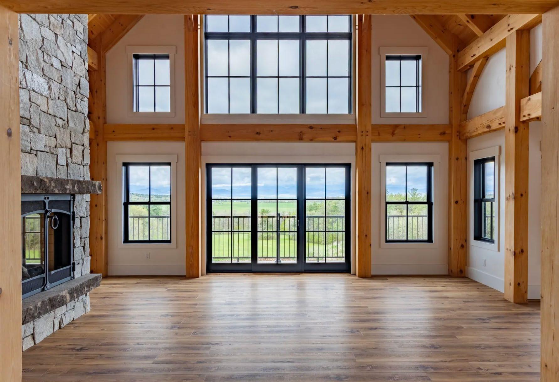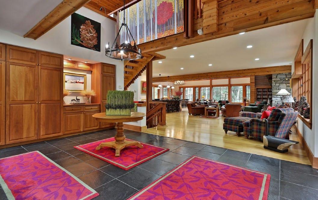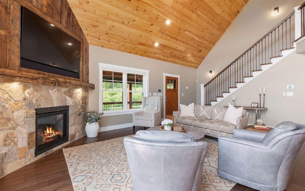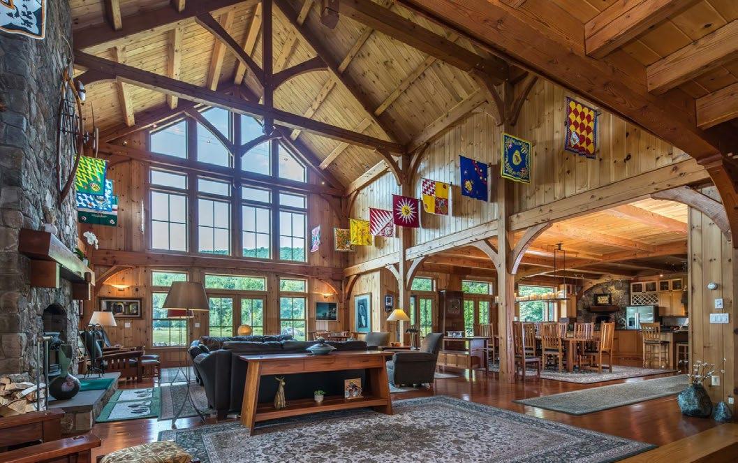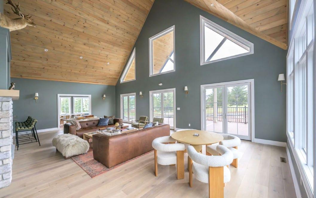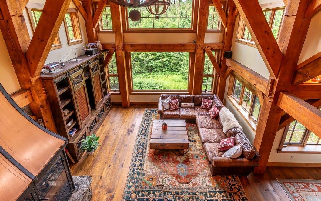 The home’s architectural highlights include hand-hewn Douglas fir beams with walnut pegs, a striking custom stone fireplace, Marvin windows, radiant heat, white oak flooring, a handcrafted maple staircase, and soaring 30foot ceilings. Designed with comfort and entertaining in mind, the spacious interior offers an effortless flow and abundant natural light throughout.