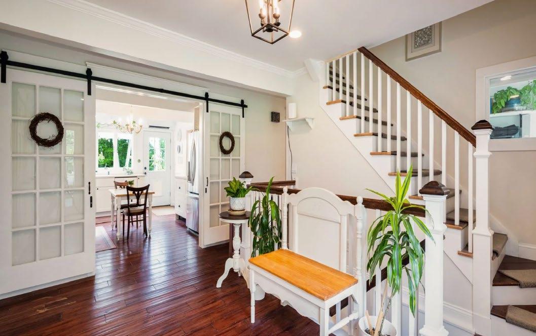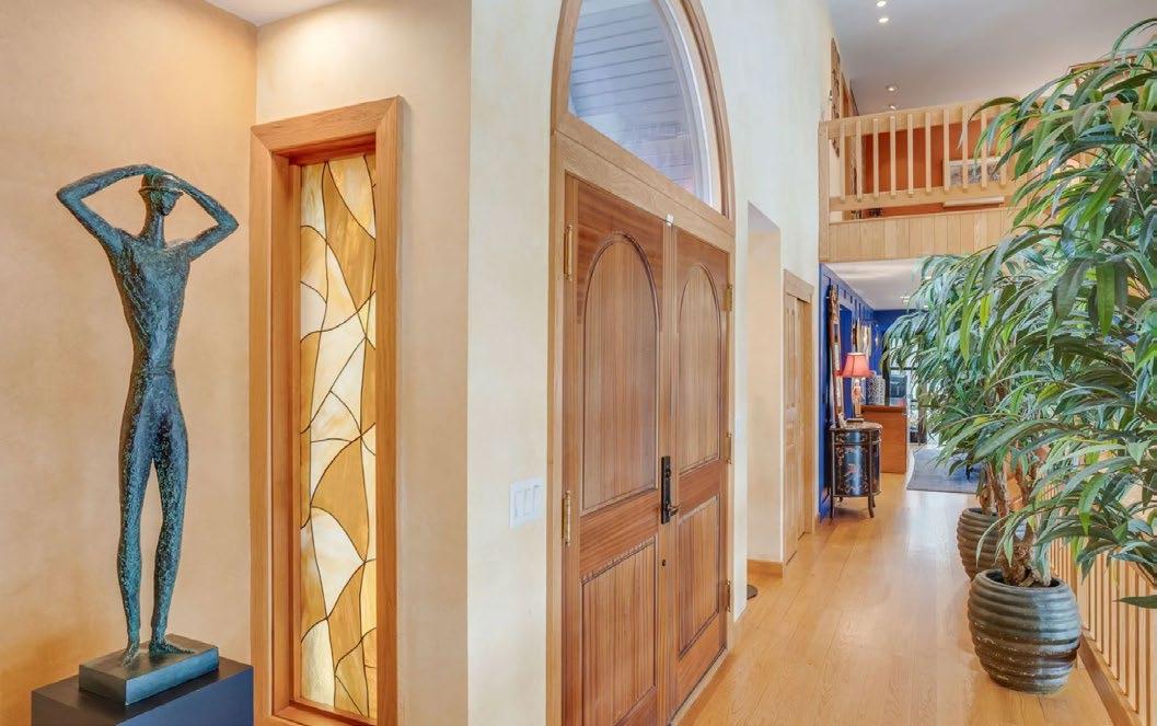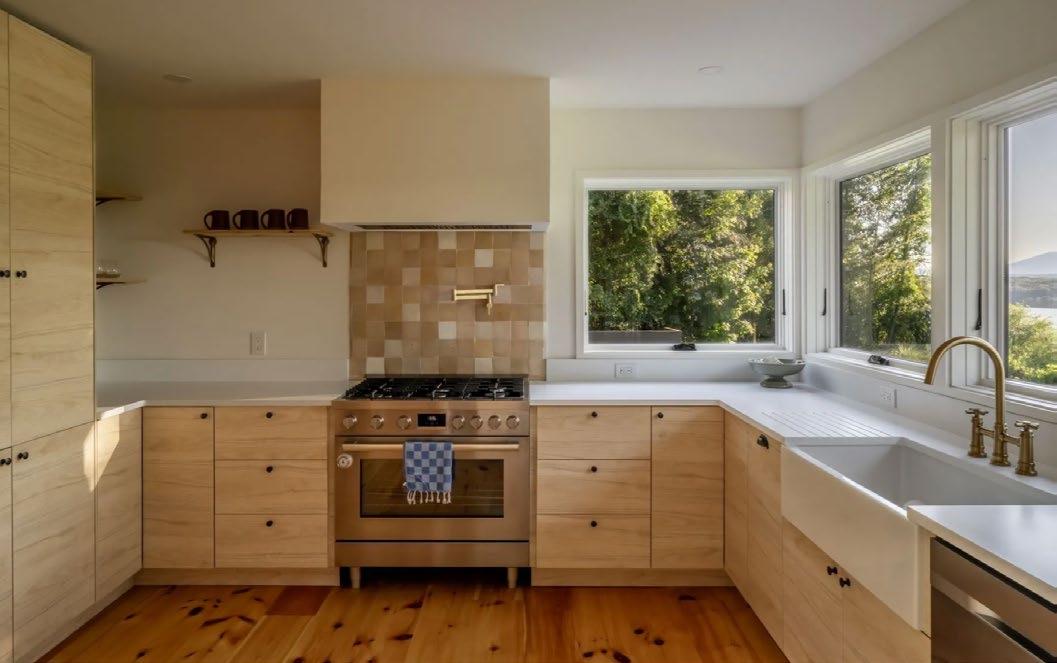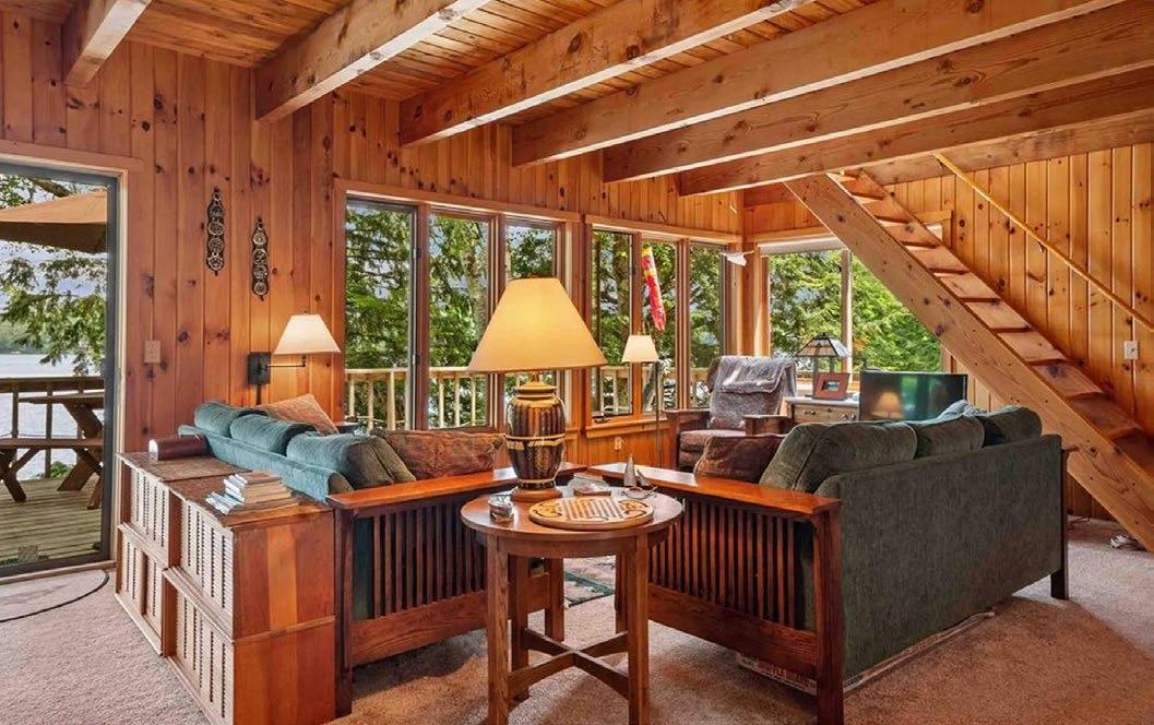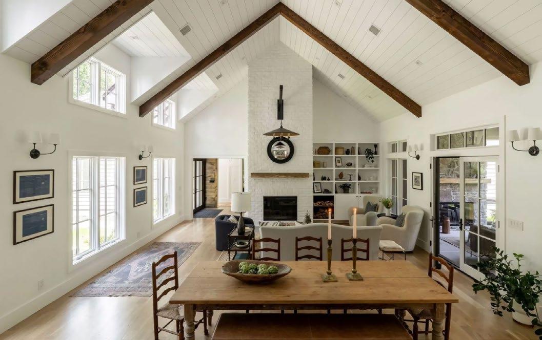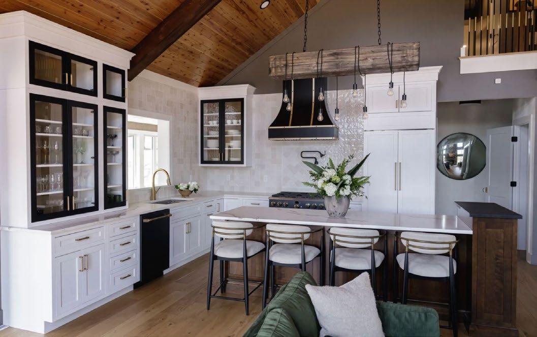 The home’s architectural highlights include hand-hewn Douglas fir beams with walnut pegs, a striking custom stone fireplace, Marvin windows, radiant heat, white oak flooring, a handcrafted maple staircase, and soaring 30foot ceilings. Designed with comfort and entertaining in mind, the spacious interior offers an effortless flow and abundant natural light throughout.