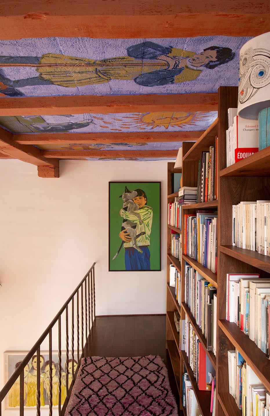 Claire Tabouret hand-painted the ceiling of her mezzanine library and the walnut bookcases were made by her husband, carpenter and musician, Nathan Thelen. Photograph: © JeanFrançois Jaussaud.All artworks by Claire Tabouret, courtesy of the artist.