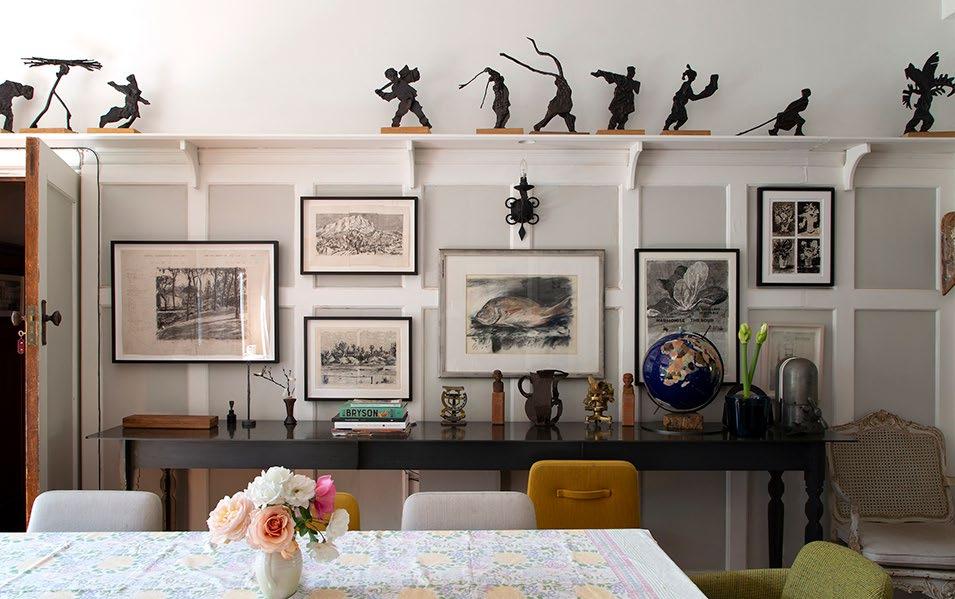 Of all the homes in the book, Kentridge’s feels the most inextricable from his practice—likely because of this history. He talks of his teenage years when he attempted—and failed—to build a makeshift studio in the garden. Later on, he turned the living room into his personal workspace, becoming the fulcrum around which his family revolved. Today, the living room is an inviting retreat, with several shelves of small bronze sculptures from his 2017 “Lexicon” series presiding over heaving bookcases, a handsome hearth and several comfortable sofas.