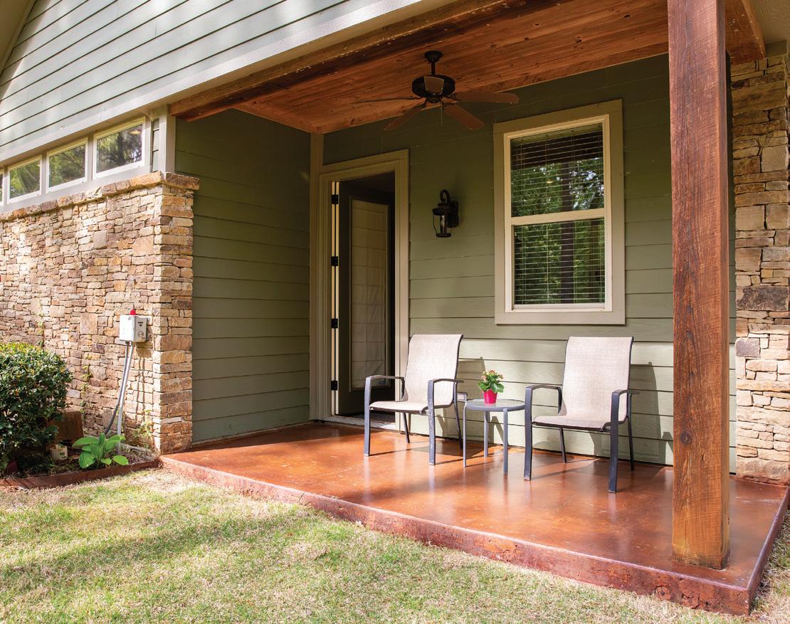 The reception area leads to the primary suite, which contains a dark wooden sleigh bed with neutral bedding, contrasting beautifully with the eggshell-blue walls. The bathroom contains a large stone shower, soaking tub, and spacious walk-in closet. A door in the suite opens to a small back patio, one of Beth’s favorite spots. “We wake up, have our coffee there, let the dog out; it’s a relaxing space,” she said. The Worthens dog, a Blue Lacy named Daryl, has plenty of room to play while the couple prepares for the day.
