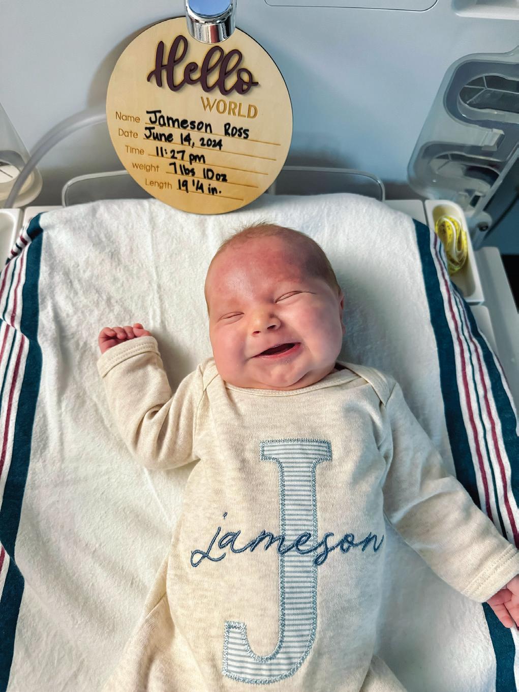 Jameson McDonald was born at 11:27 p.m. on June 14th, 2024. “Hooch got to cut the umbilical cord, which was a monumental moment for us, and a memory that will stay with me forever,” Amy said.