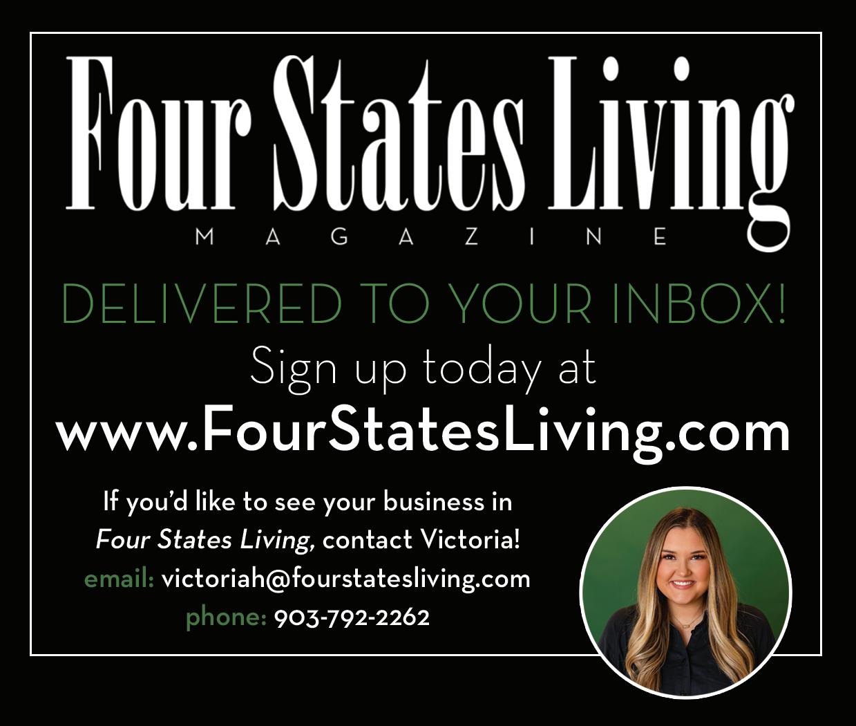 Advertising rates may be obtained by contacting the Sales Department at 903-7922262, writing to Four States Living Magazine, 4104 Summerhill Square, Texarkana, Texas 75503, visiting our website www.fourstatesliving.com or emailing our Sales Department at info@fourstatesliving.com
