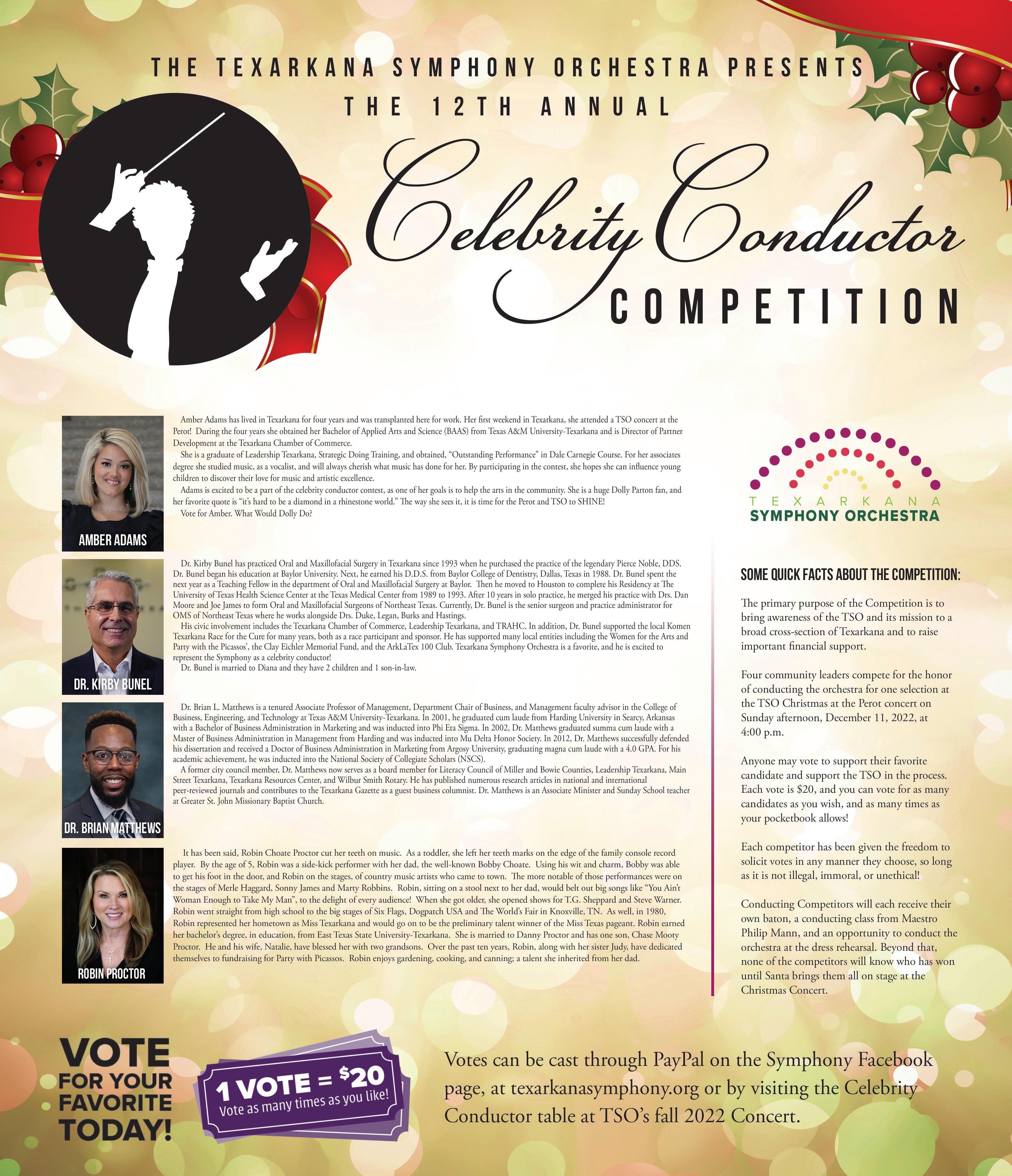 A Texarkana tradition, the Texarkana Symphony Orchestra will present “Christmas at the Perot” during a 4 p.m. performance. This holiday concert for the whole family will feature TSO, members of the Texarkana Community Ballet, the Texarkana Youth Symphony Orchestra and the TSO Chamber Singers. Also, the winner of TSO’s annual Celebrity Conductor Competition will be announced. Call 903-792-4992 for tickets, or visit: www.perottheatre.org