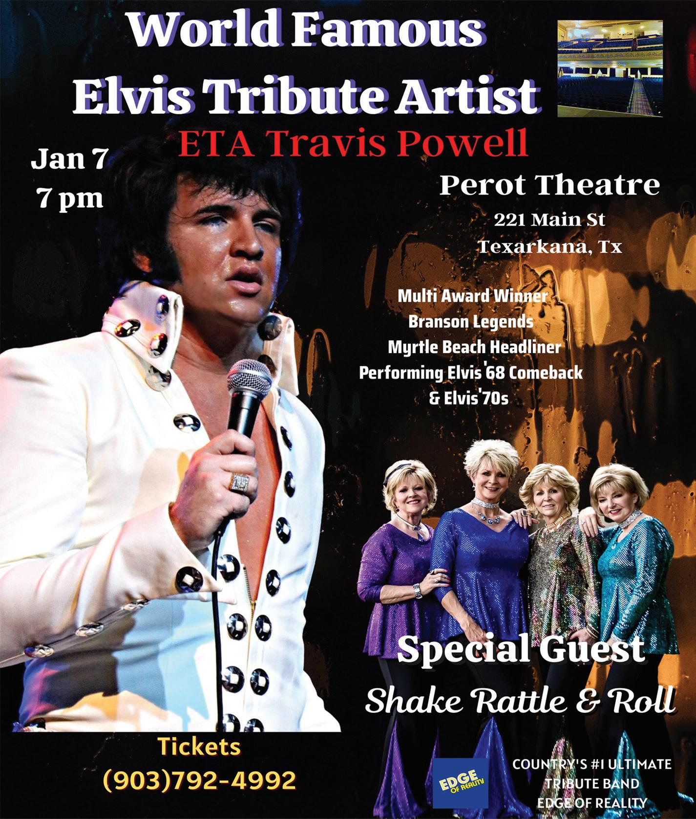 Elvis tribute artist Travis Powell will entertain guests during a 7 p.m. performance in the Historic Perot Theatre. The all female group, Shake, Rattle & Roll, will open the concert. Tickets can be found at: www.perottheatre.org