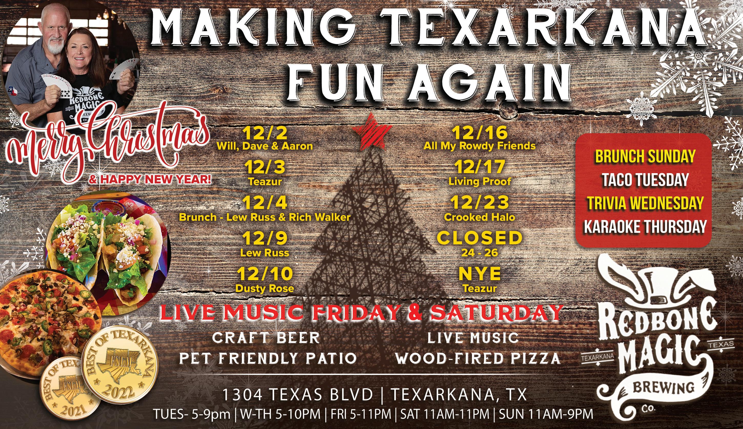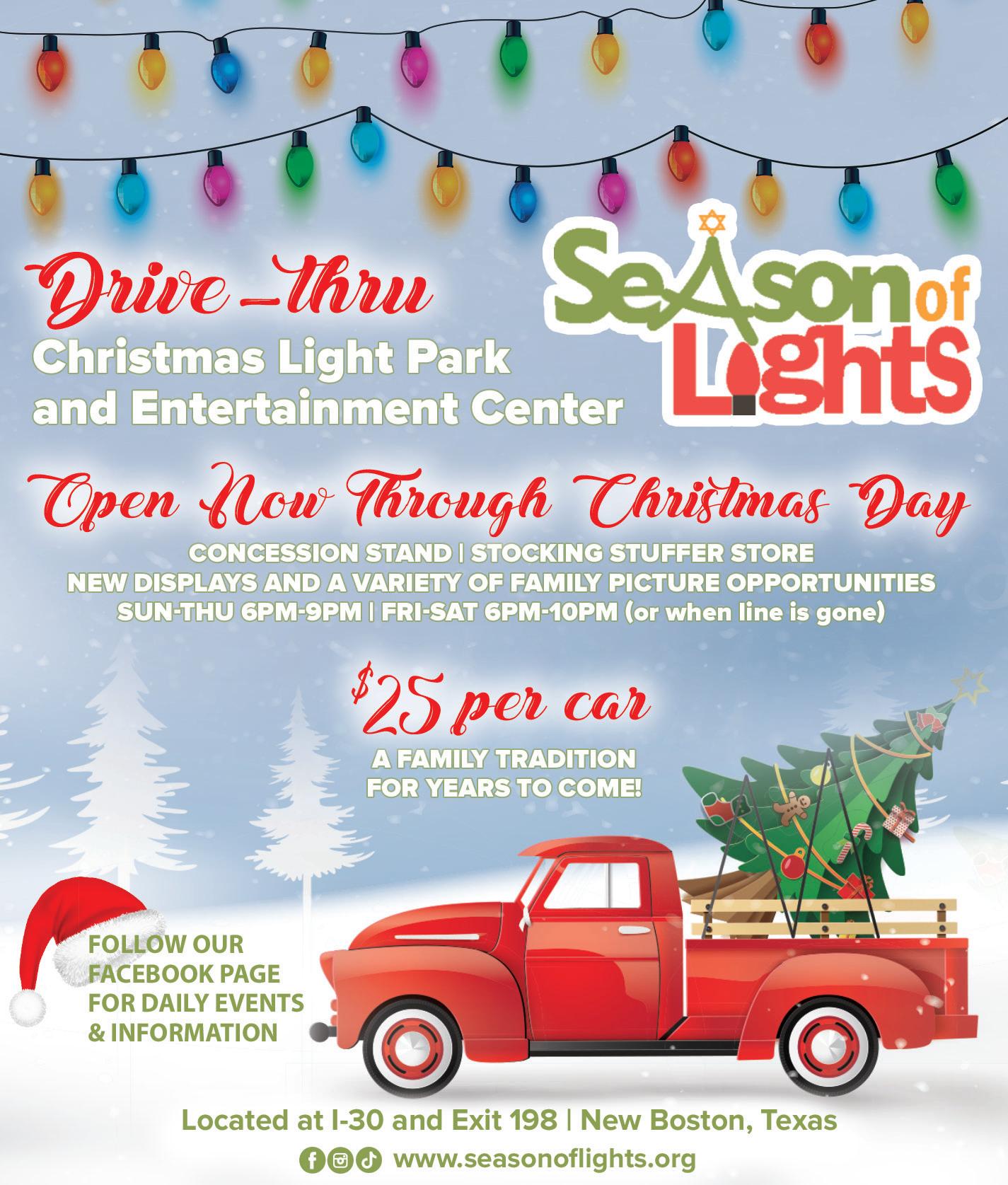 Premier event sponsor, Farmers Bank & Trust, will present Christmas on Main at the Perot Theatre, located at 221 Main Street. Activities will include movies, vendors, carolers, carriage rides, food trucks, kids’ crafts, and an ice skating rink. Purchase tickets at www.perottheatre.org or at the Perot Theatre Box Office. Call 903-792-4992 for more information.