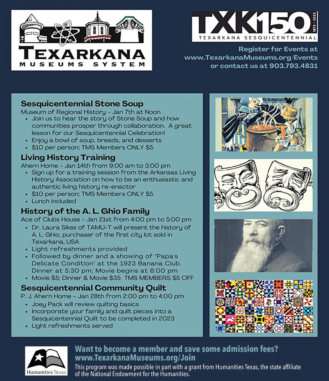 Living History Training will take place from 9 a.m. to 3 p.m. at the Ahern Home. This session by the Arkansas Living History Association will train people to be enthusiastic and authentic living history reenactors. Cost is $10 per person or $5 for TMS members. Lunch is provided. Call the Texarkana Museums System at 903-793-4831 for information.