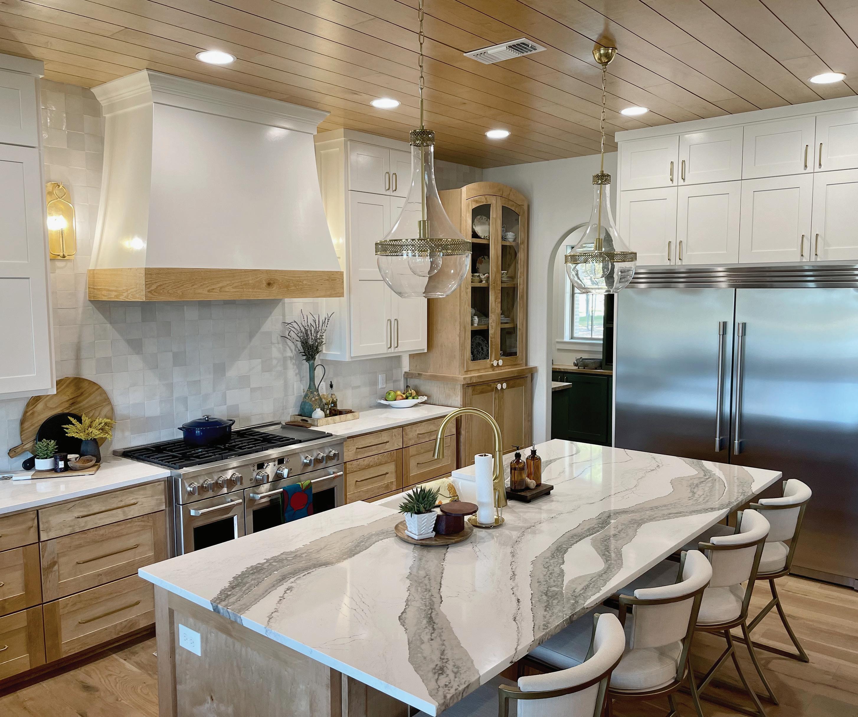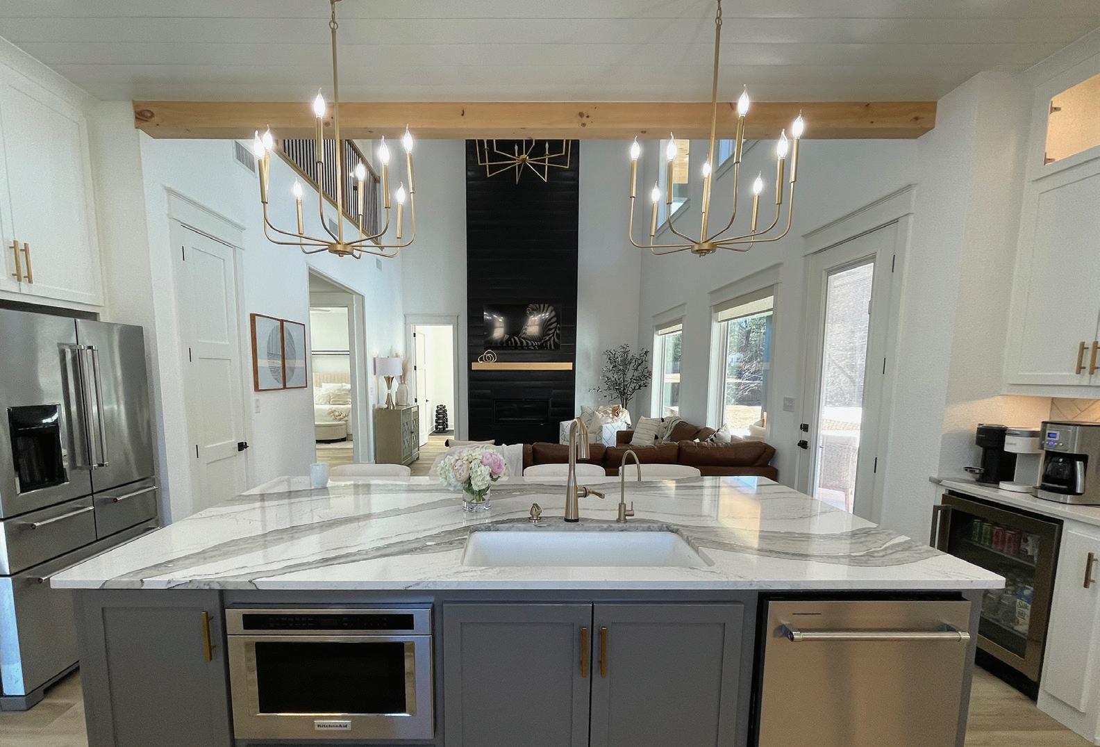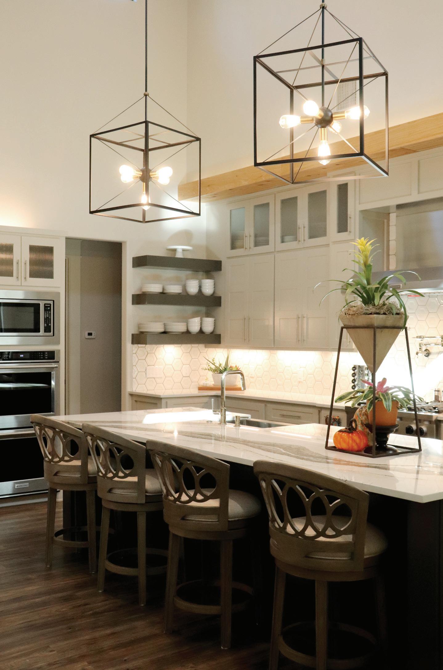 Functional, livable and comfortable, the modern cottage-inspired home of Suzy and Kyle Osburn creates the perfect space for them and their three children, River, Zimri and Zailee. The exposed raw white oak beams in their kitchen enhance the organic feel of the room while quartz countertops, stainless steel appliances, and streamlined cabinets add to the modern feel.