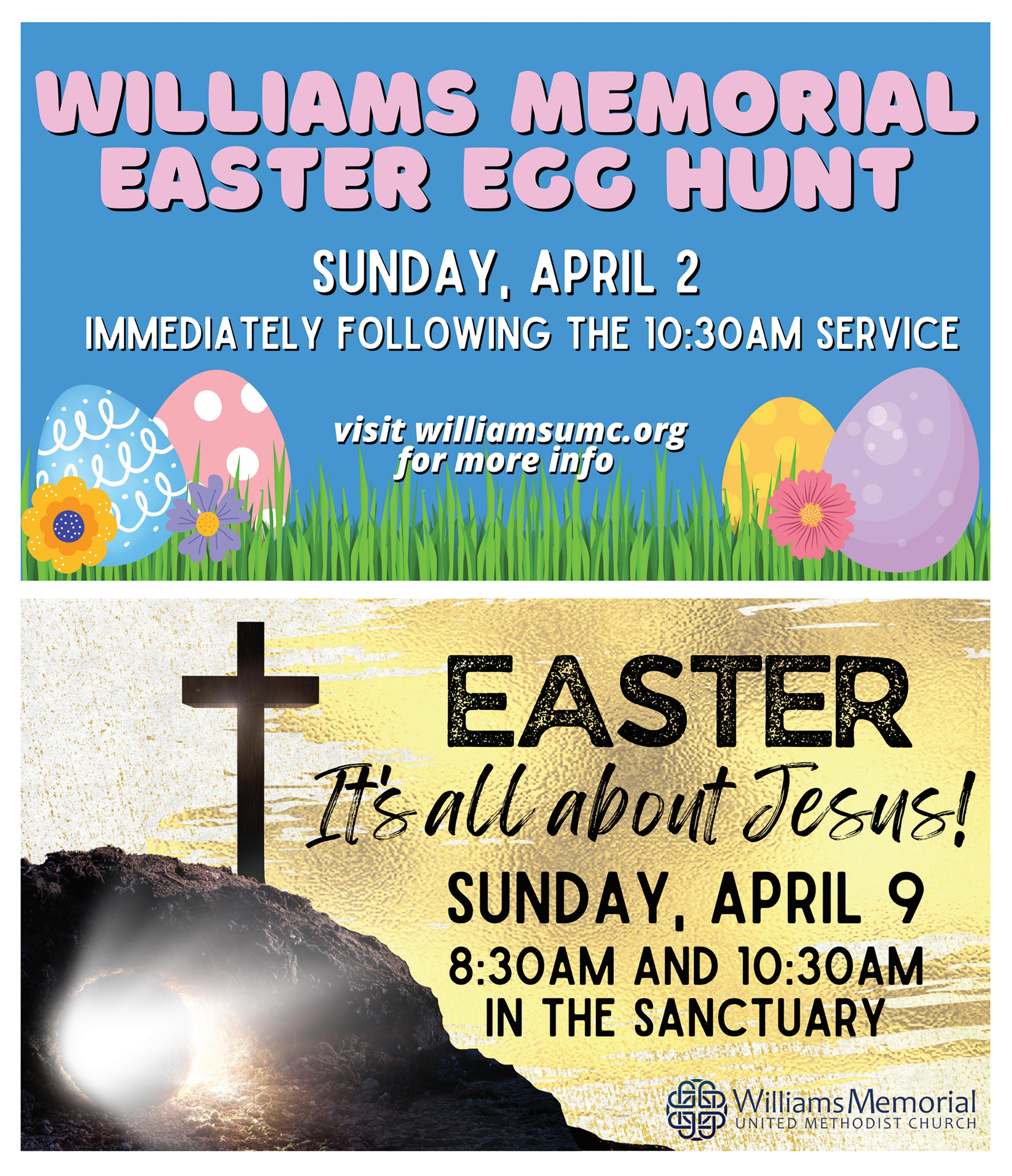 Williams Memorial United Methodist Church will host its annual Easter Egg Hunt immediately following the 10:30 a.m. service. Visit www.williamsumc.org for more information.