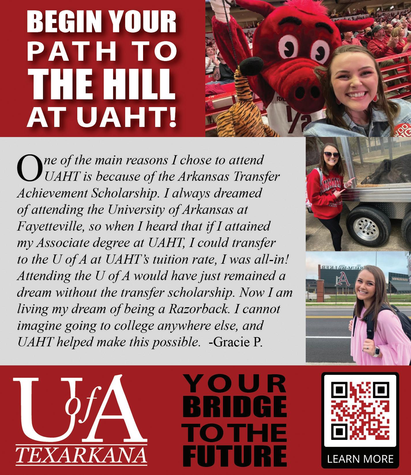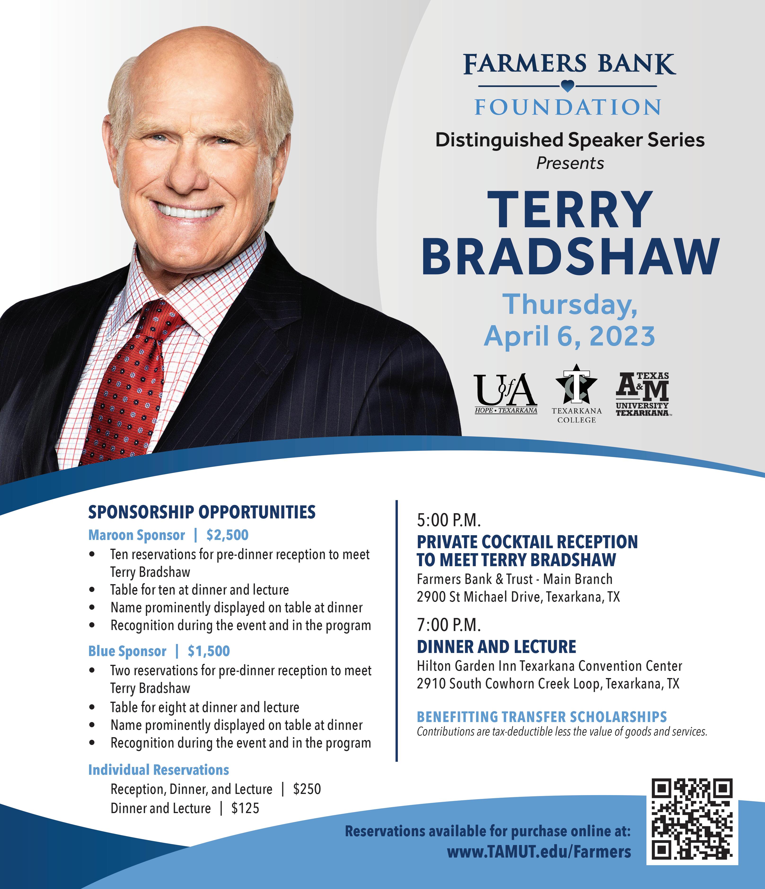 Farmers Bank Foundation will present Terry Bradshaw during its Distinguished Speaker Series. A private cocktail reception will be held at 5 p.m. at Farmers Bank & Trust located at 2900 St. Michael Drive. A dinner and lecture will be held a 7 p.m. at the Hilton Garden Inn Texarkana Convention Center. All proceeds will benefit transfer scholarships. Scan the QR code on the Farmers Bank Foundation ad on page 75 for more information.