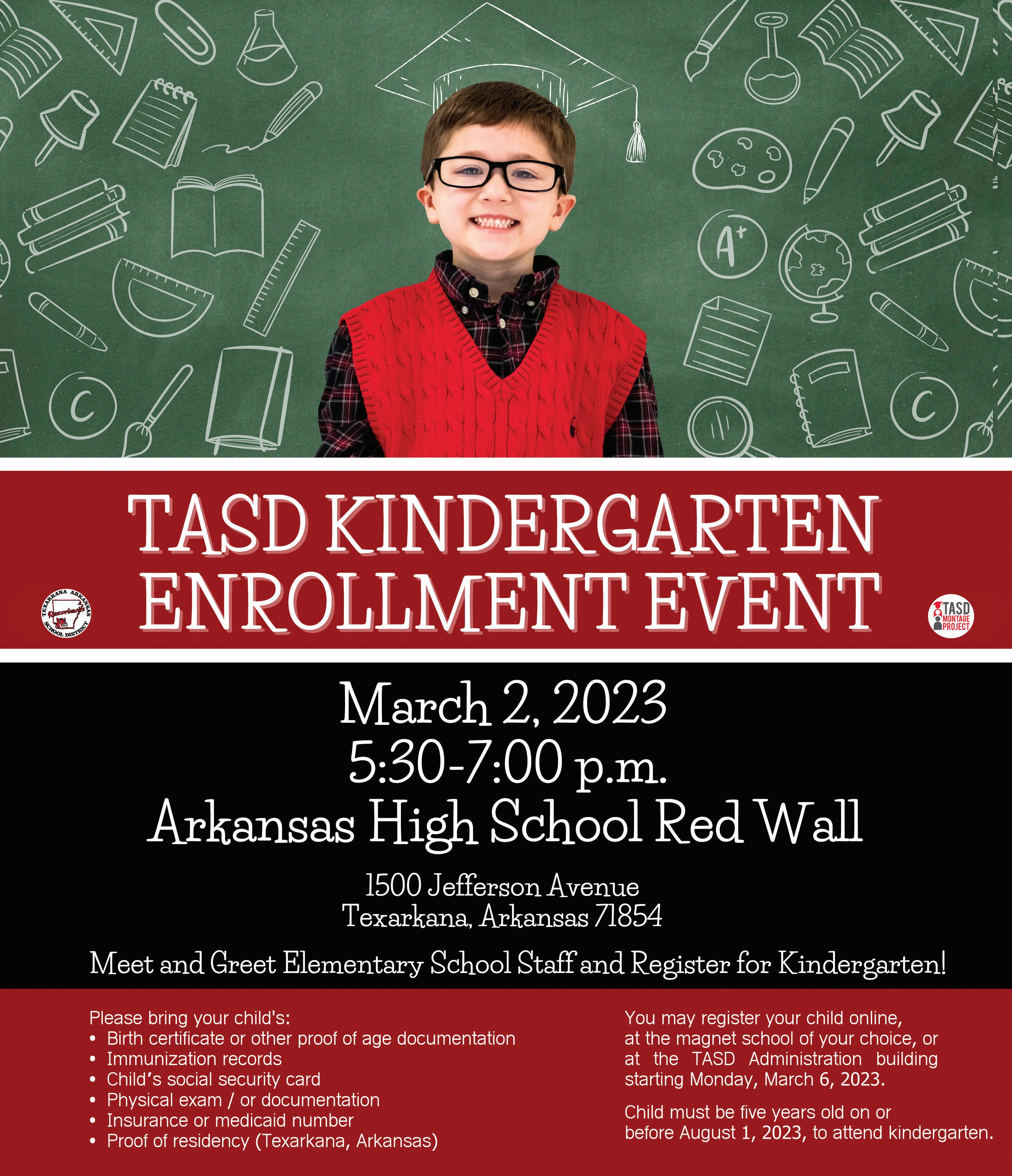 Texarkana Arkansas School District will host a kindergarten enrollment event from 5:30 p.m.-7 p.m. at the Arkansas High School Red Wall. A meetand-greet for elementary school staff will be held, along with kindergarten registration.