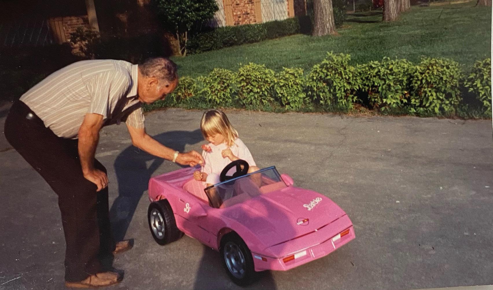 Papa Jack helps Felicia learn to drive her Barbie car in front of their original home.