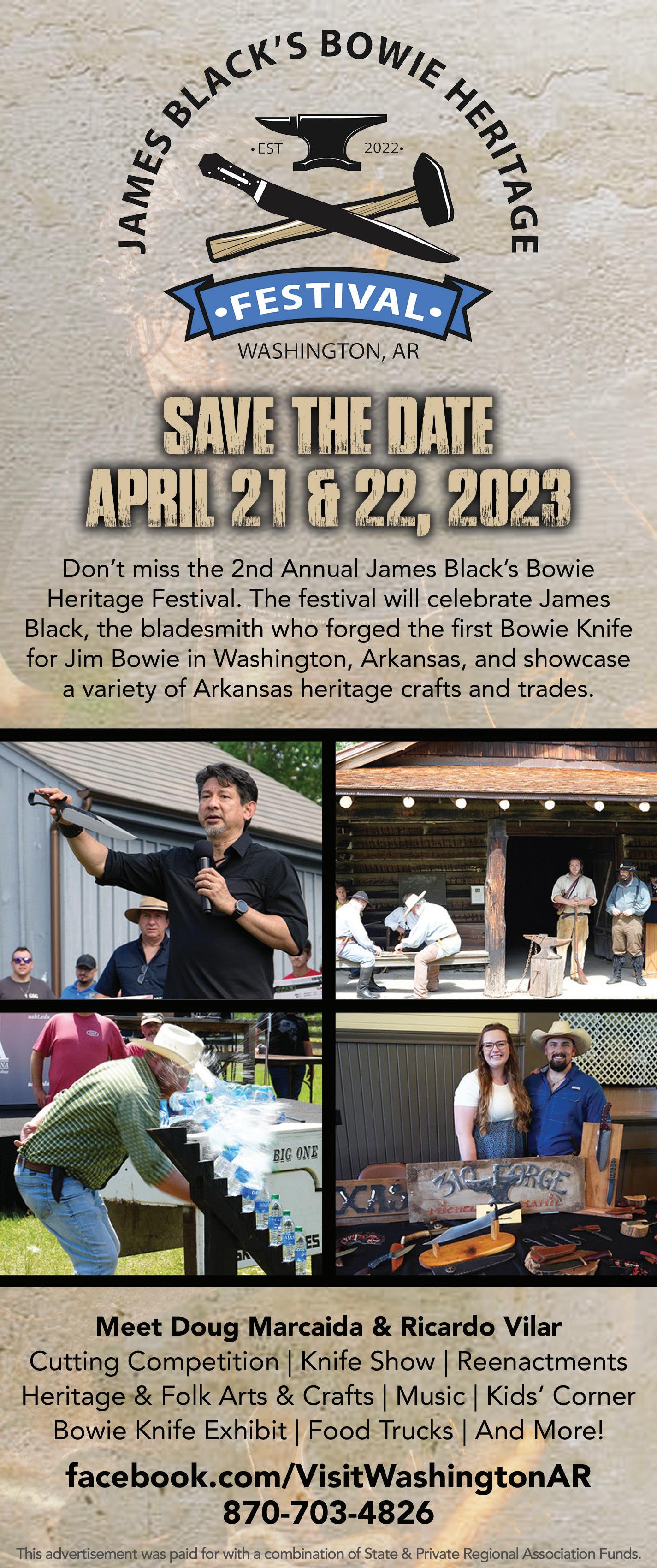 The second annual James Black’s Bowie Heritage Festival will take place in Washington, Arkansas. The festival will celebrate James Black, the bladesmith who forged the first Bowie knife for Jim Bowie, and showcase a variety of Arkansas heritage crafts and trades. Visit Washington, AR’s Facebook page for more information, or call 870-703-4826.