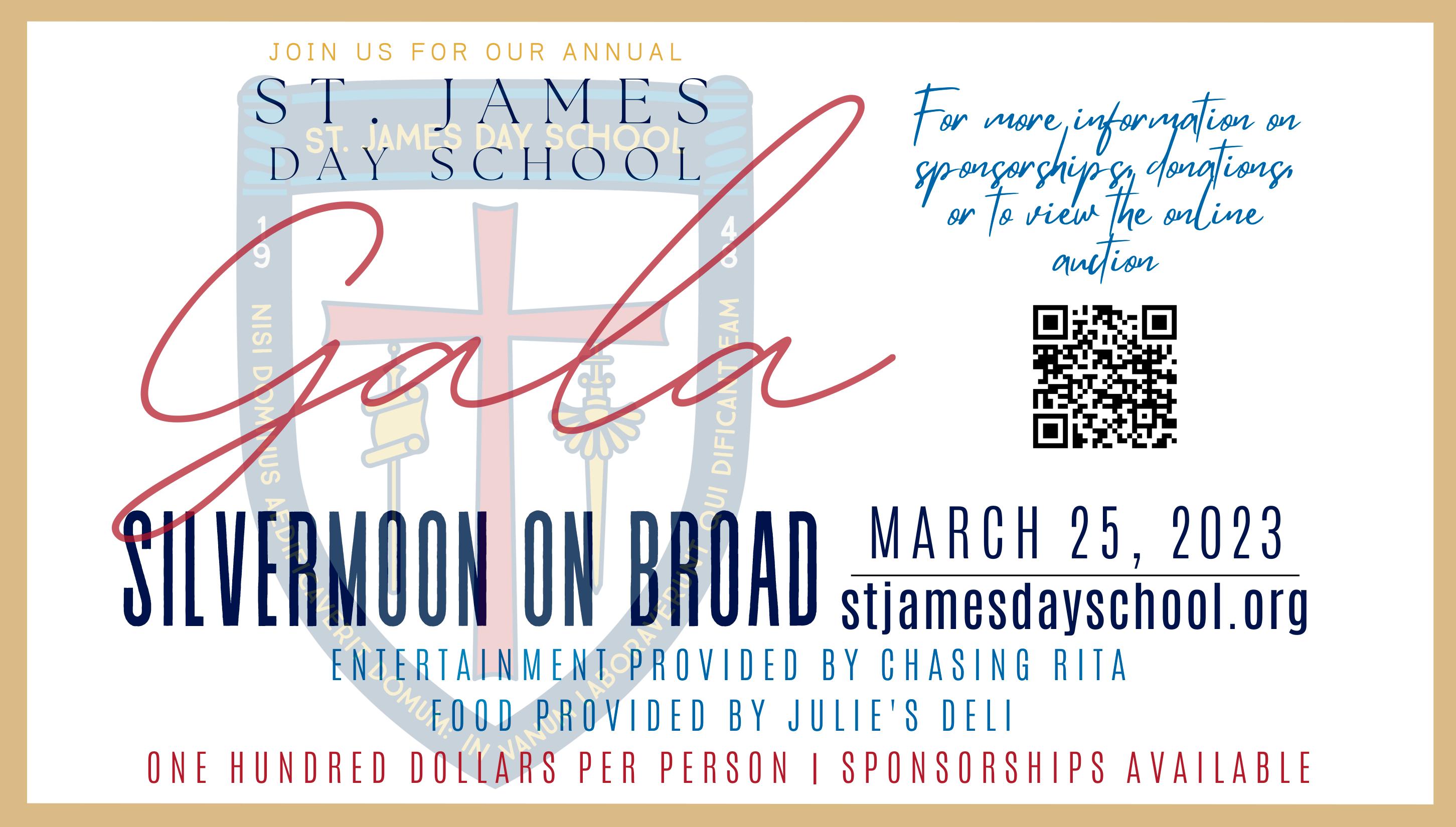 The St. James Day School Gala will take place at Silvermoon on Broad. Entertainment will be provided by Chasing Rita, and food will be provided by Julie’s Deli. Tickets are $100 per person. Scan the QR code on the St. James ad on page 40 for more information.