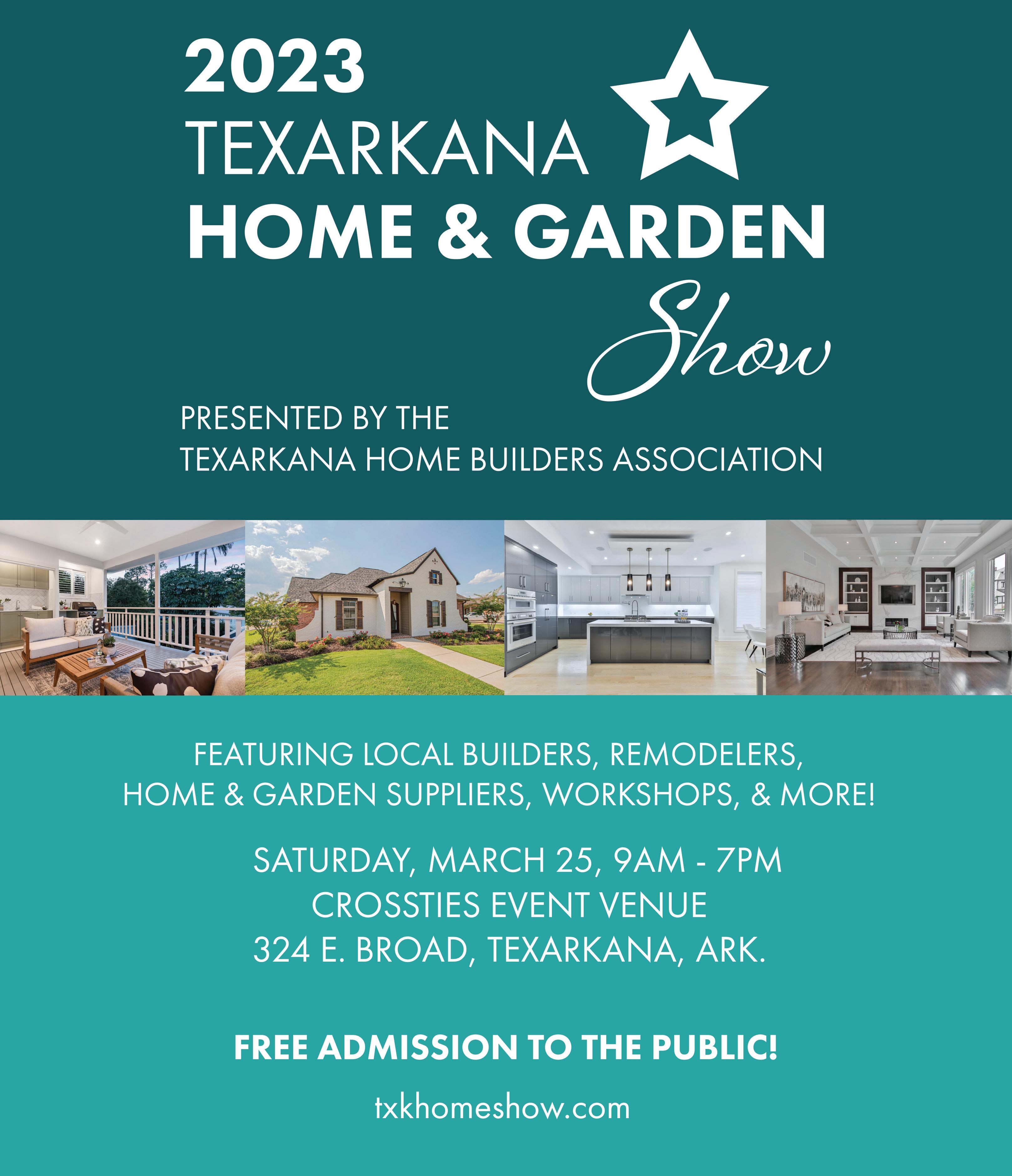 The Texarkana Home Builders Association will host its annual Home & Garden Show at Crossties Event Venue. Held from 9 a.m. to 7 p.m., the event will introduce Texarkana residents to local builders, remodelers, home and garden suppliers, and other related companies. Visit www.txkhomeshow.com for more information.