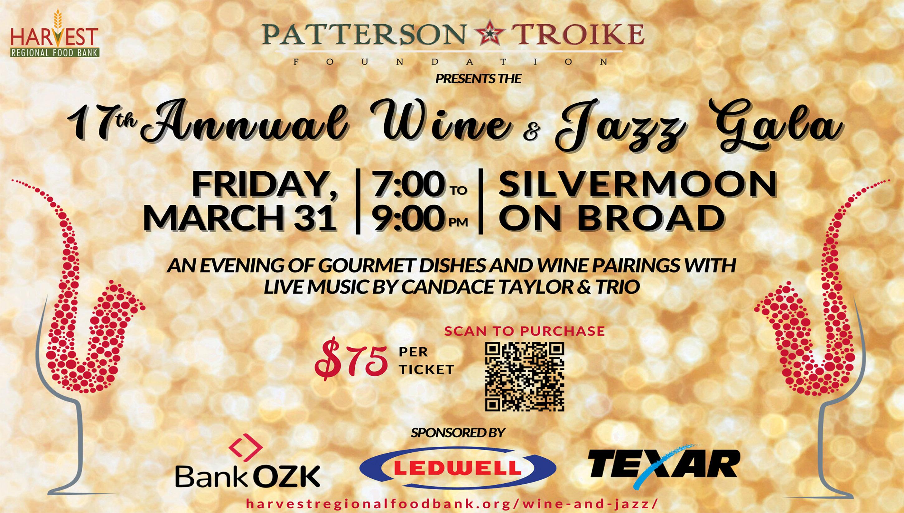 The Patterson Troike Foundation will present Harvest Regional Food Bank’s 17th annual Wine & Jazz Gala from 7 p.m.-9 p.m. at Silvermoon on Broad. The evening will consist of gourmet dishes and wine pairings with live music by Candace Taylor and Trio. Tickets are $75 per person. Scan the QR code on the Harvest Regional Food Bank ad on page 73 for more information.