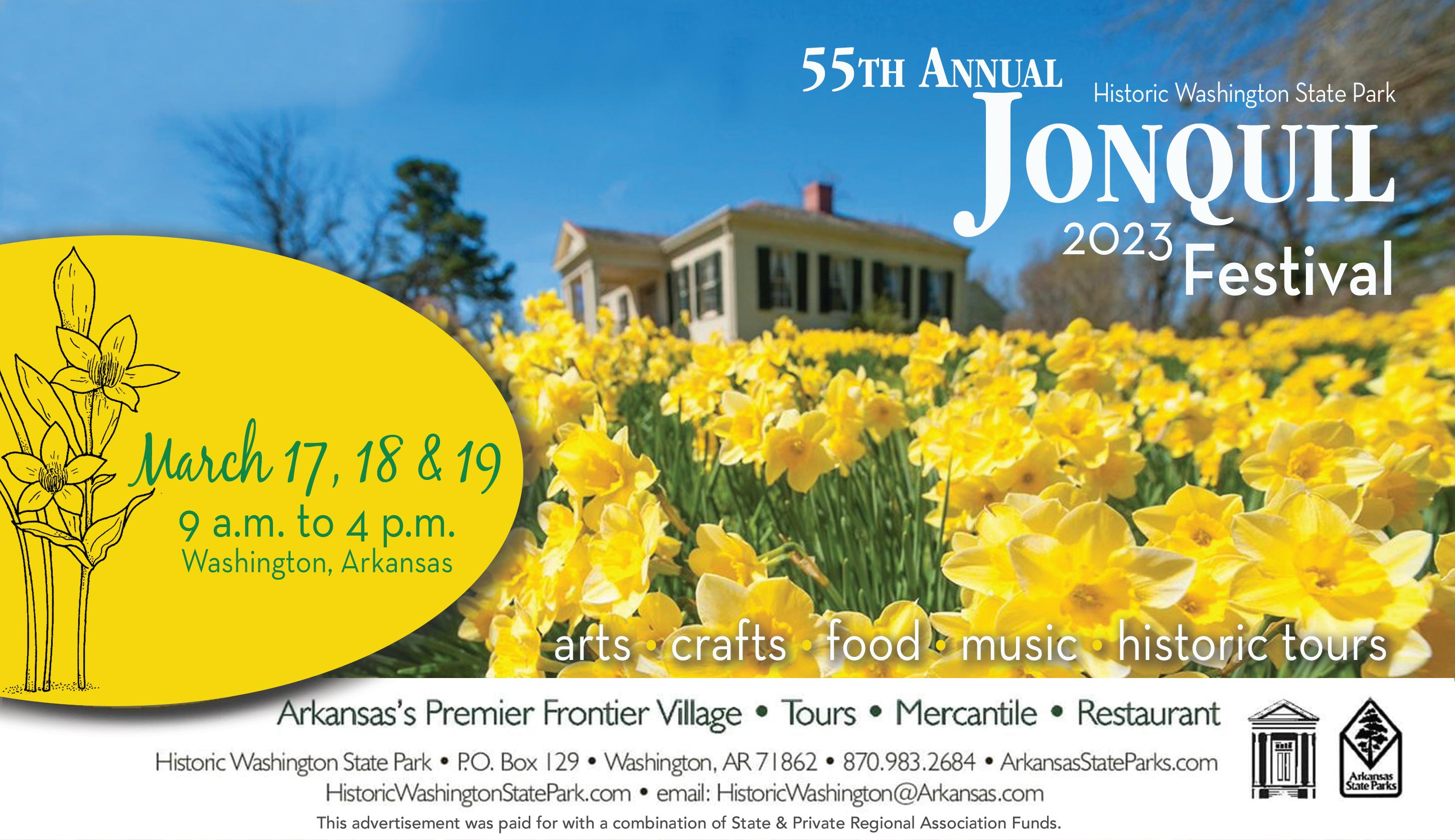 The 55th annual Jonquil Festival will be held in Historic Washington State Park. The festival heralds the arrival of spring in Southwest Arkansas as thousands of jonquils welcome craftspeople, entertainers, and visitors. Visit www.historicwashingtonstatepark.com for more information.