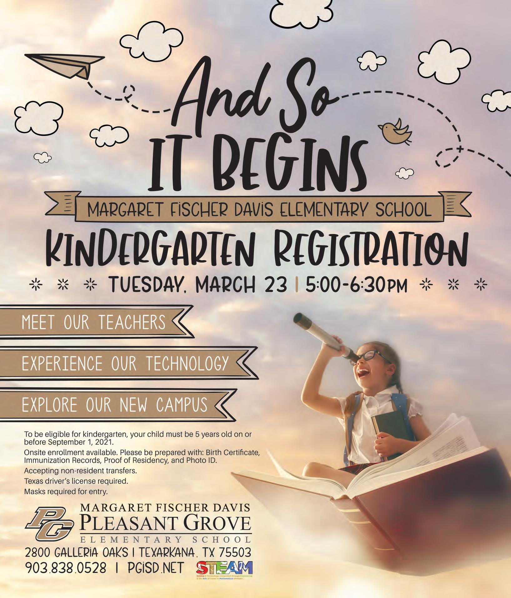 Davis Elementary School will host its Kindergarten Registration from 5-6 p.m. at the new campus, located at 2800 Galleria Oaks. New students and their families will be able to meet the teachers and tour the campus during this time. Call 903-838-0528 for more information.