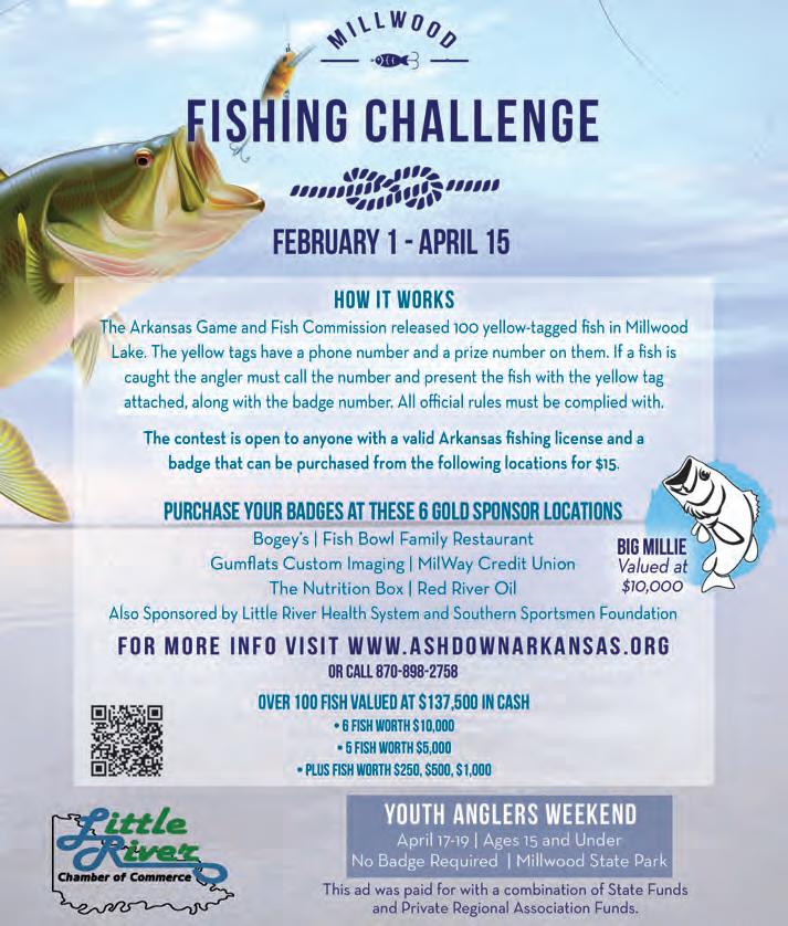 Over $137,500 in cash will be awarded during the Millwood Fishing Challenge. The Arkansas Game and Fish Commission has released 100 yellow-tagged fish in Millwood Lake. The tags include a phone number and a prize number on them. If a fish is caught, the angler must call the phone number on the tag and present the fish with the yellow tag attached, along with the badge number. To obtain the rules or for more information, visit: www.ashdownarkansas.org or call 870-898-2758.