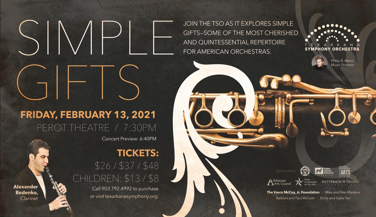The Texarkana Symphony Orchestra will present “Masterworks II: Simple Gifts” during a 7: 30 p.m. performance in the Perot Theatre. Some of the most cherished and quintessential repertoire for American orchestras will be performed and will feature clarinetist, Alexander Bedenko. For tickets, call the Perot Theatre Box office at 903-792-4992.