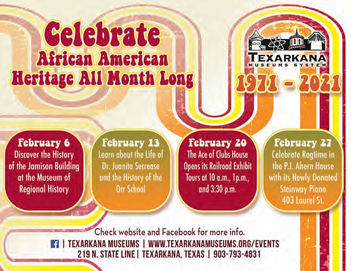 The 19th annual Regional Celebration of African American Artists Exhibit will be displayed in the Regional Arts Center, located at 321 West 4th Street in Downtown Texarkana. Come explore the African American artists’ exhibits which will include quilts, fabrics, and fibers. Call 903-792-8681 for more information.