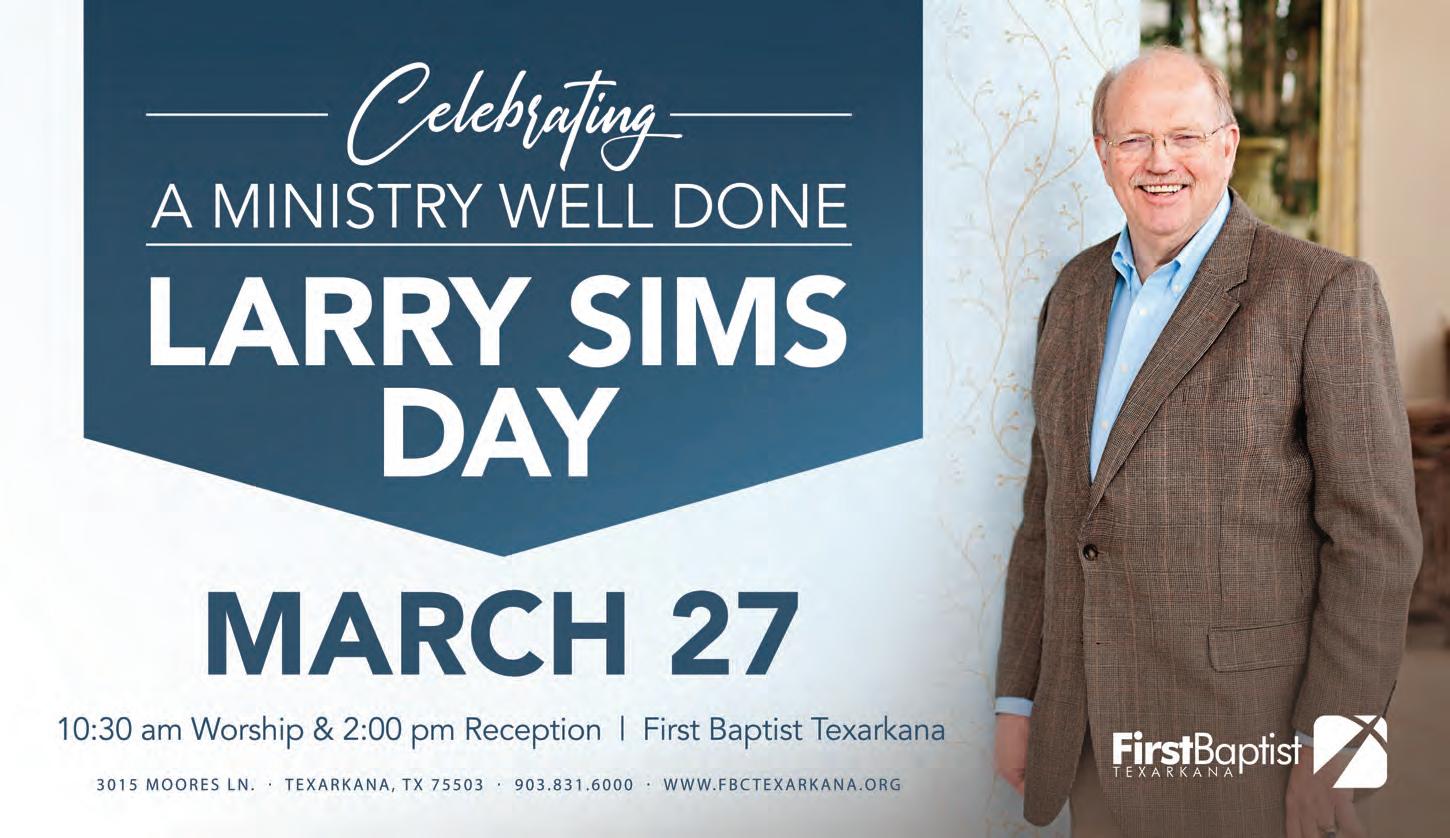 The First Baptist Church Texarkana will host Larry Sims Day. Activities will include 10:30 a.m. worship and a 2 p.m. reception. Call 903-831-6000 for more information.