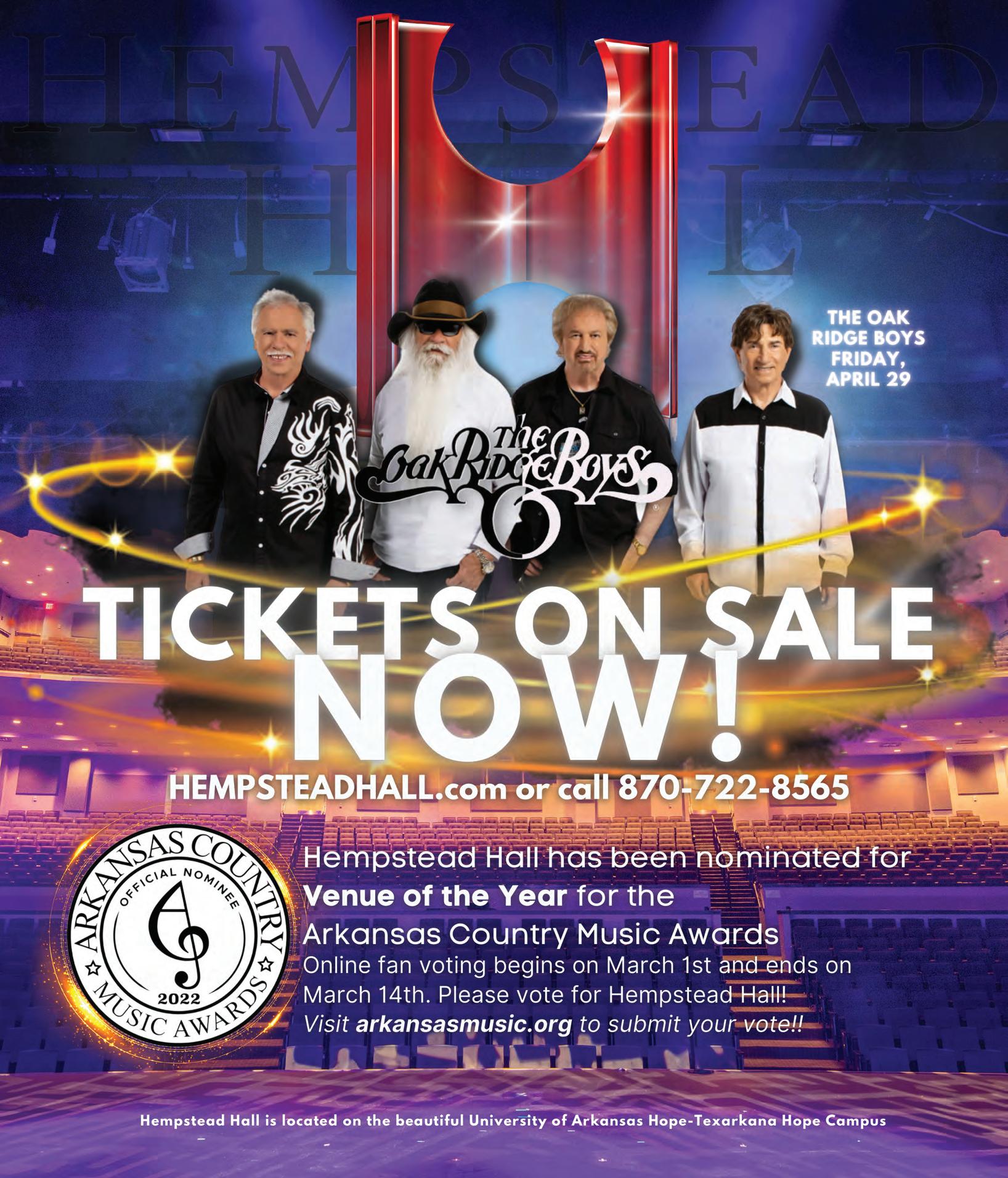 The Oak Ridge Boys will perform at Hempstead Hall, located on the University of Arkansas Hope-Texarkana Hope Campus. For ticket information, visit: www.hempsteadhall.com or call 870-722-8565.