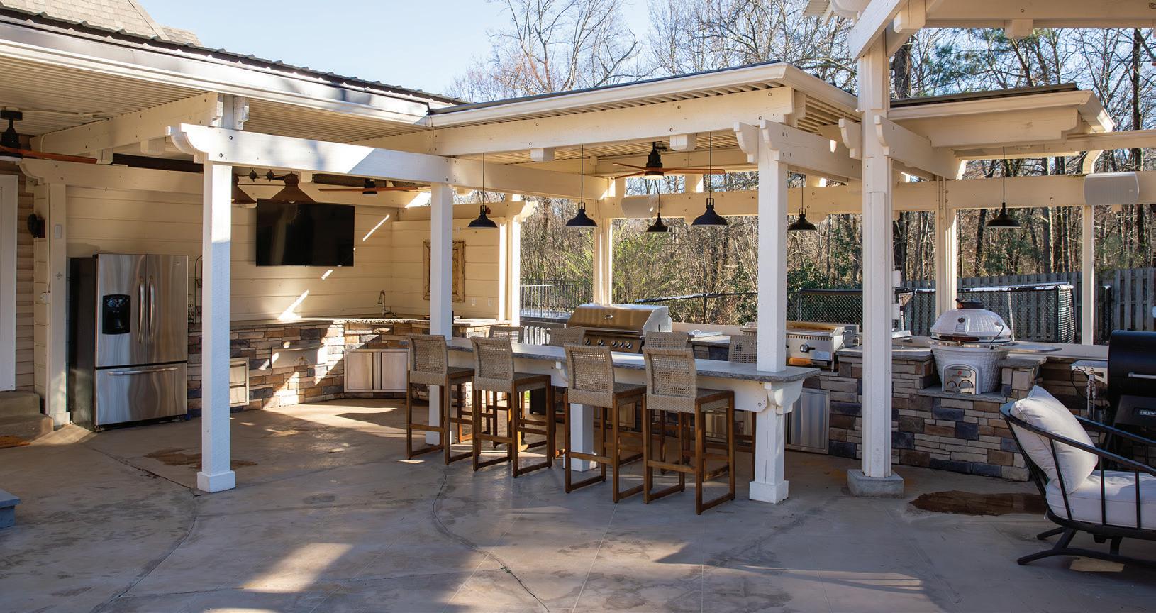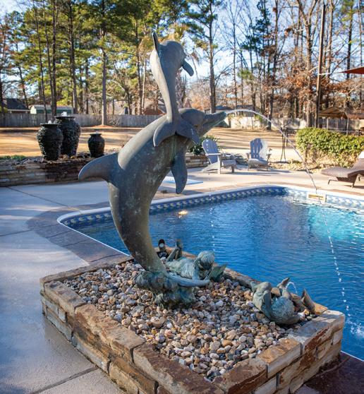 Looking out to the backyard reveals an oasis where the family can gather for fun and relaxation. A large covered back porch hosts a large table with tall stools, lounge chairs, and an outdoor cooking area. A swimming pool completes the space, with a whimsical dolphin fountain from Las Vegas spraying water.