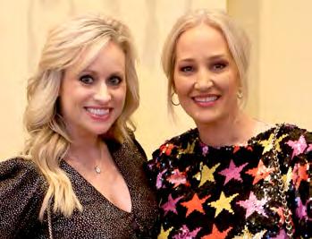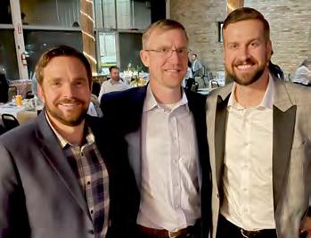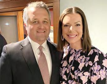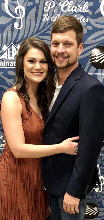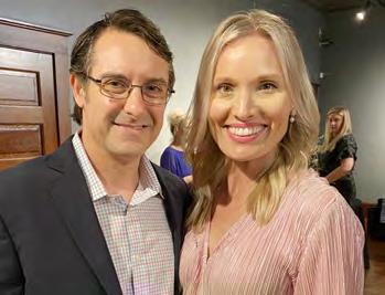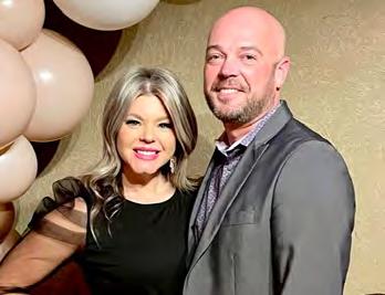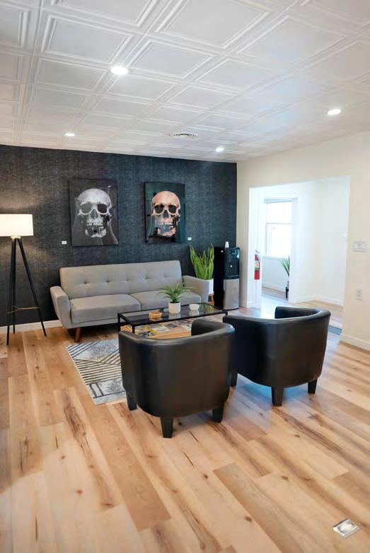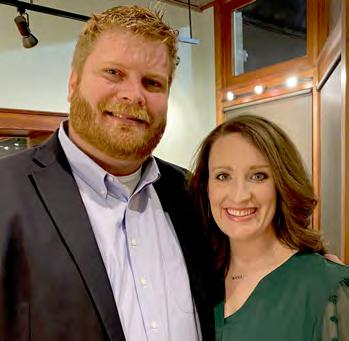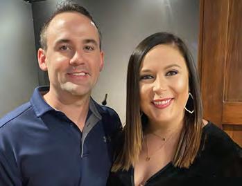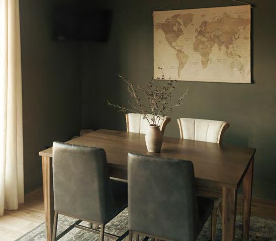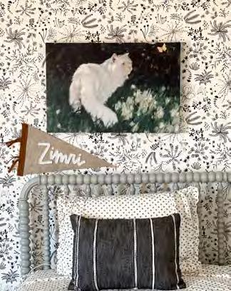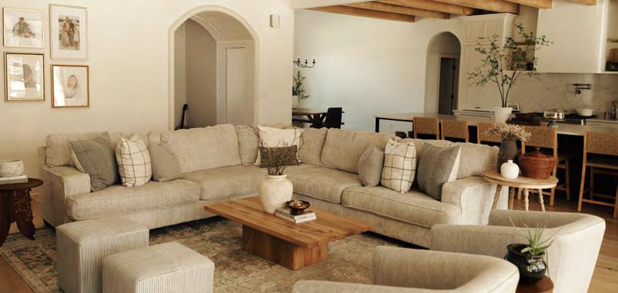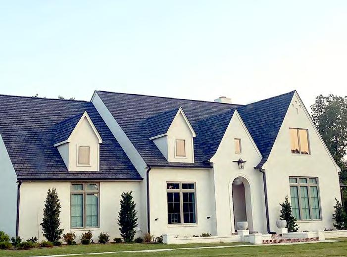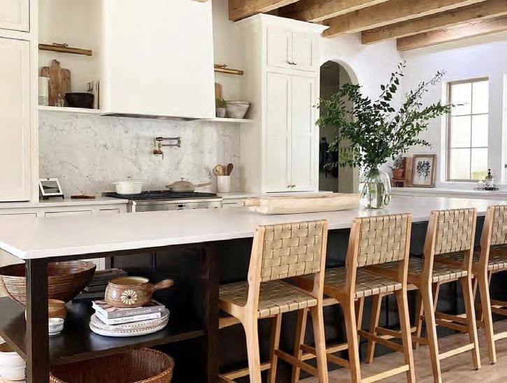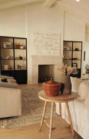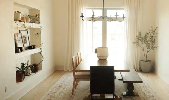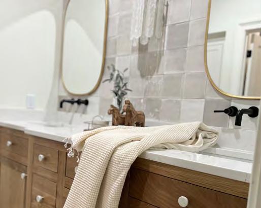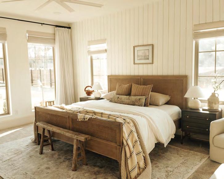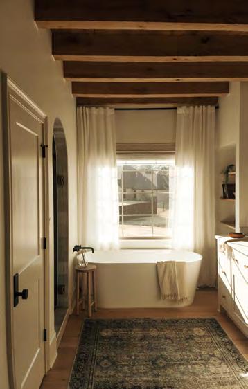 Peace and tranquility are apparent in the master suite, located on the west end of the home. Soft textures and neutral tones create a peaceful vibe as one enters the space. Comfortable seating allows the Osburns to sit, unwind, and talk about their day. Floorto-ceiling curtains cover the tall windows allowing Suzy and Kyle to regulate the amount of sunlight they want to invade their private space. A shiplap accent wall adds visual interest to the room while the wooden bed serves as the focal point. The luxurious master bath resembles a relaxing spa retreat. The latest bath amenities are included here with a walk-in tile shower, soaking tub, quartz countertops, and twin vanities. Candelabra wall sconces from Logan Electric flank the dual mirrors, adding just enough soft lighting to enhance the bath’s cozy ambiance.