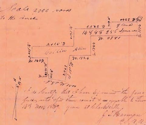 A portion of the 1838 Patent for the Collin Akin Headright Survey, A-1. First Abstract of land in Bowie County. Measurements are in varas. (Document from Texas GLO Office.)