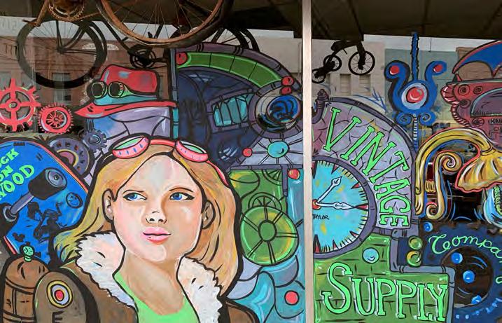 Knock on Wood Vintage Supply Co.’s storefront window in Downtown Texarkana features one of Darlene’s murals.