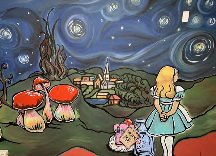 Darlene created this mural at Hippie Soul, located in Idabel, Oklahoma. The inside and outside of the entire building is painted to resemble “Alice in Wonderland” scenes and Vincent Van Gogh’s style.