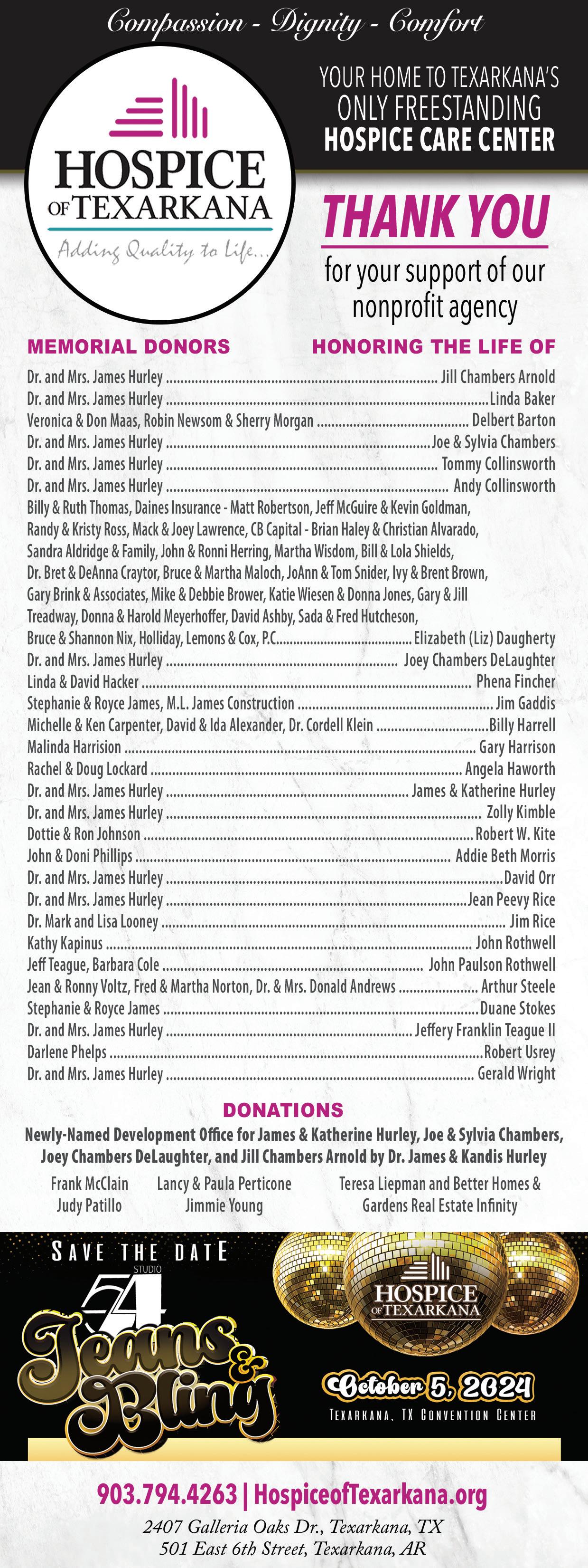 Although Hospice care is very heavy work, the organization works hard to find balance. One way they do that is through their annual Jeans & Bling event. The fundraiser is a Texarkana tradition that helps to increase awareness of Hospice of Texarkana’s services while also building the financial support needed to cover costs of their inpatient facility—the only inpatient hospice facility in the area.