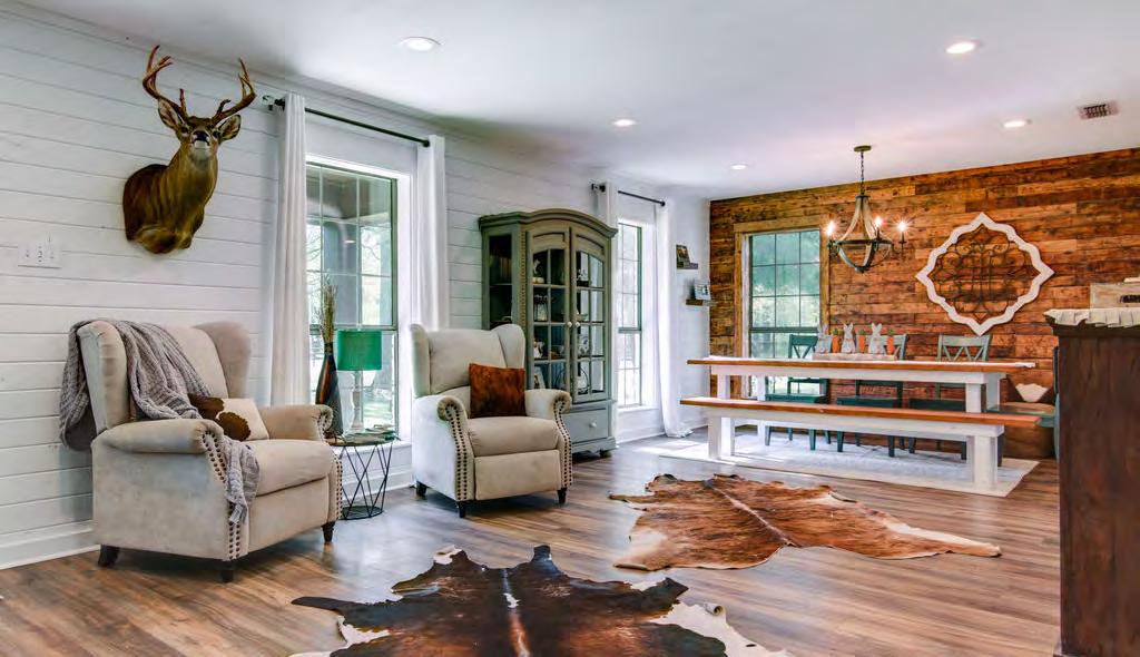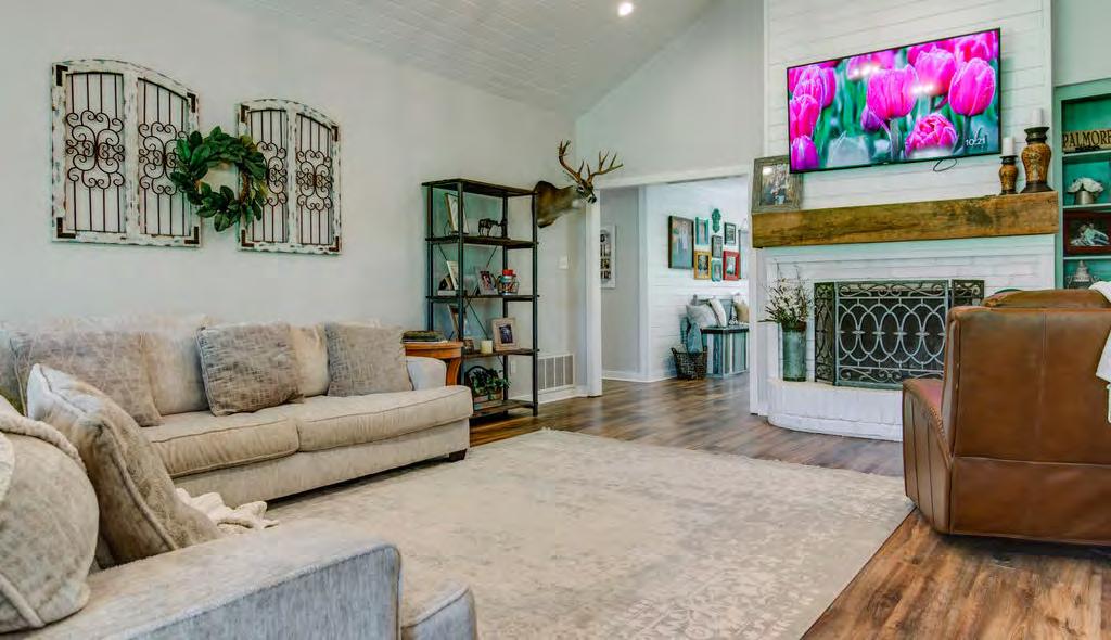 The massive living area features a painted brick wood-burning fireplace with shiplap paneling and a sturdy oak mantle. To the right of the fireplace is a bookcase, housing family mementoes and photographs. An ornate fireplace screen adds a unique design element to the space. Comfortable sofas and recliners are strategically placed so that every guest can view the flat-screen TV while large windows allow them to look out to the backyard and pasture.