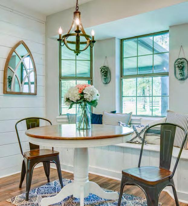 A wood and wrought iron chandelier adds rustic charm to the breakfast nook. Perfect for