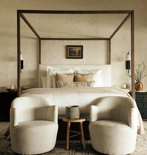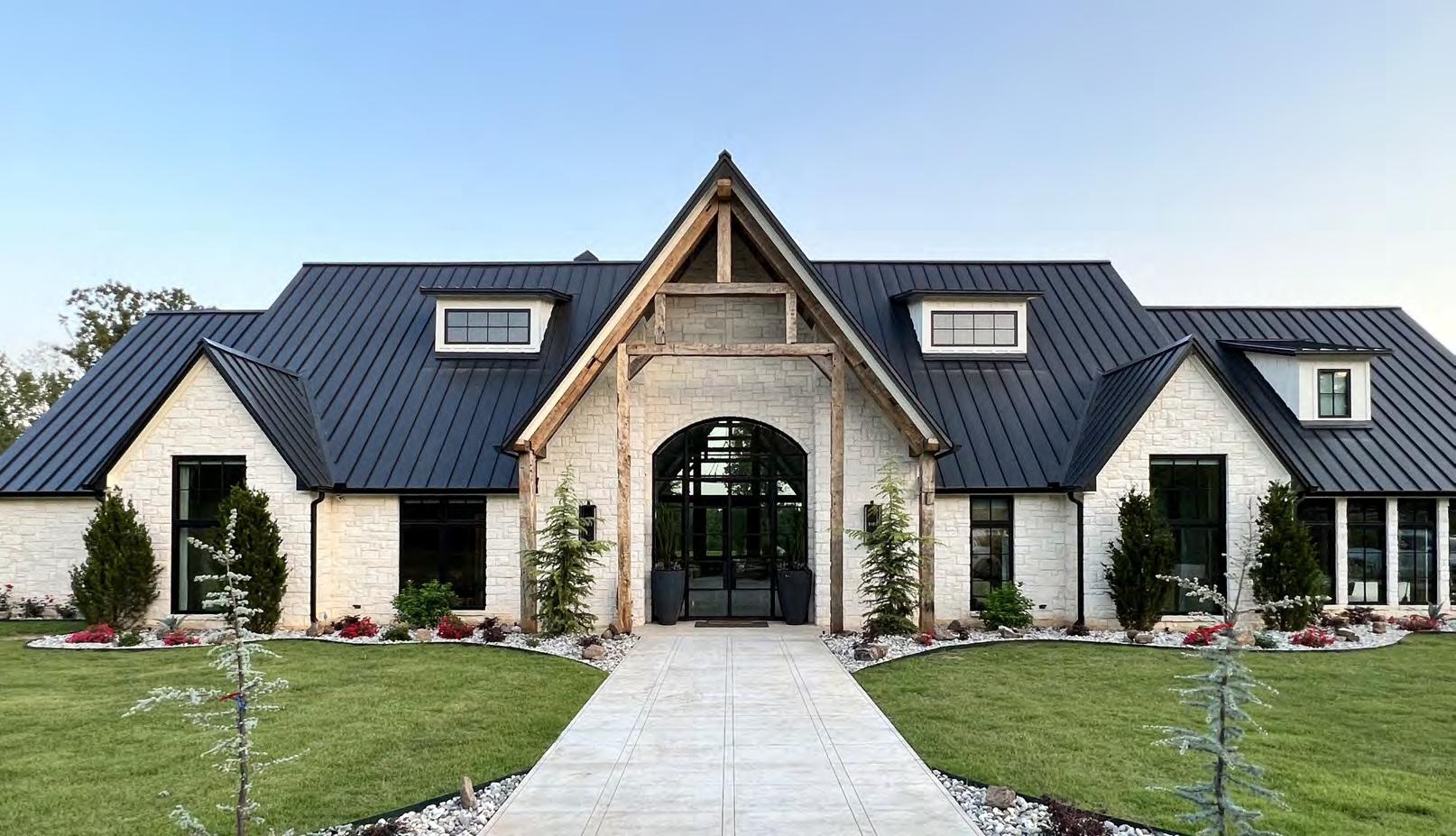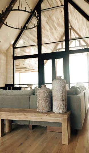 Reminiscent of a modern mountain home, Barbara and Robert Trumble’s four bedroom, three bath, two story Redwater beauty is strategically tucked amongst 130 acres with a 10-acre pond directly in the backyard. Located a short drive from town, massive oak trees surround the home, adding solitude and solace to the property. The use of clean lines, natural elements, large windows, and earthy tones accentuate this distinctive contemporary style while geometric shapes and various textures complement the modern design.