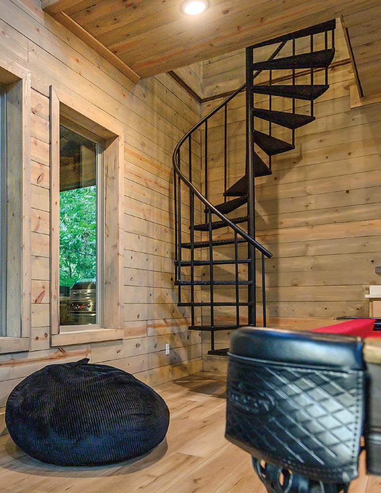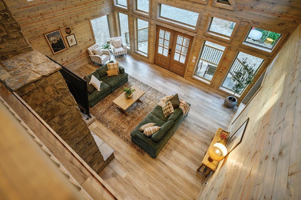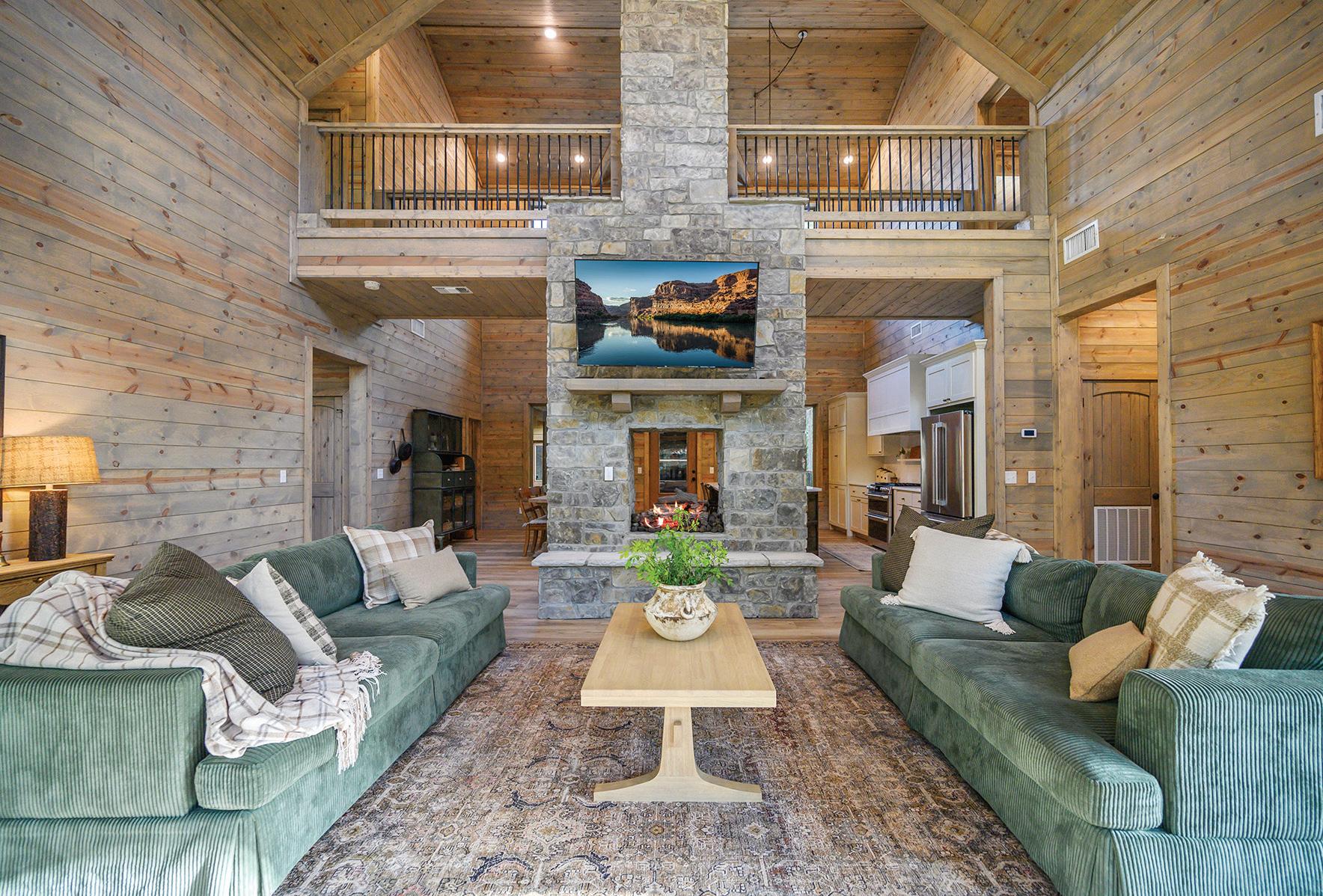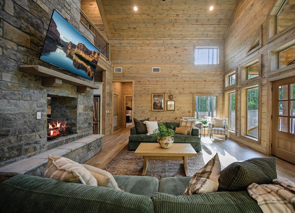 The cabin exterior leaves a lasting impression, with an elevated front entrance and expansive windows. Inside the structure, tall ceilings allow natural light to flood into each room from the many windows. Calming earth tones of green, brown, and tan are prevalent throughout the interior. The giant stone fireplace separating the living room and kitchen further promotes a feeling of comfort and coziness.