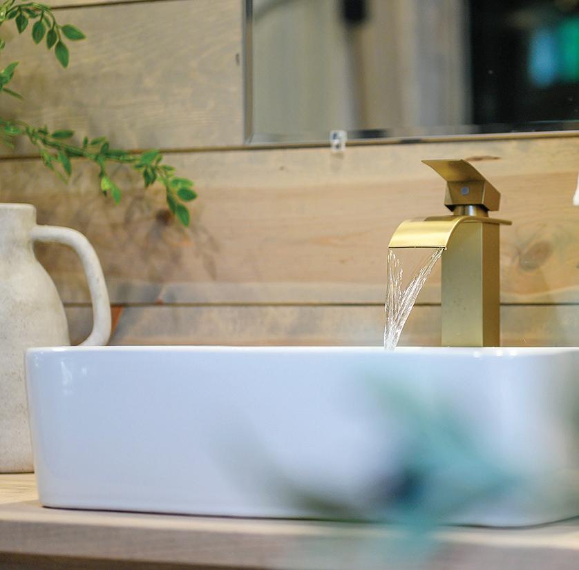 The back-and-forth dance between quaint and extravagant is evident everywhere in the cabin. Deer antlers hang above oil paintings; a pair of golden bookends are shaped like duck heads. Each bathroom is a delicate combination of gold fixtures and gingham curtains. All the bedrooms feature classy bed frames, fun printed pillows, and the same soft earth tones. The bunk rooms are clever space-saving designs, with the bunk beds and ladders built into the walls.